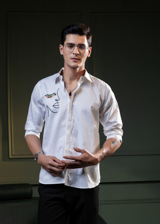 "LADY FACE" EMBROIDERED ON A WHITE SHIRT