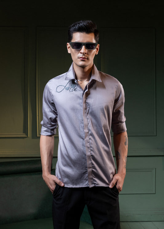 "LOVE INFINITY" EMBROIDERED ON A GRAY SHIRT