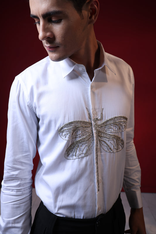 "HAND EMBROIDERED DRAGON FLY IN A WHITE SHIRT"