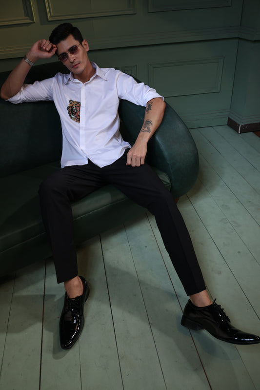 "TWO TIGERS" EMBROIDERED ON A WHITE SHIRT