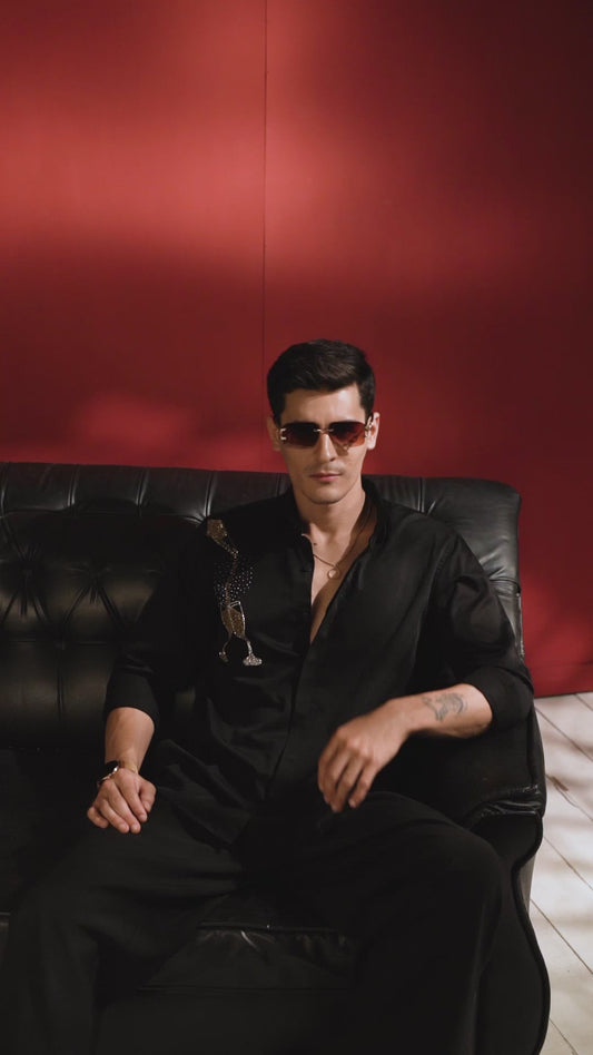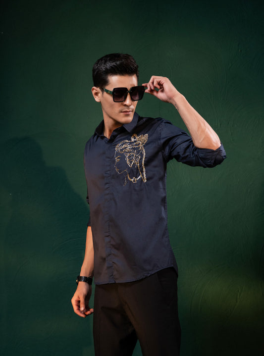 A PARTY WEAR SHIRT WITH GLASSES AND DRINKS HAND EMBROIDERED