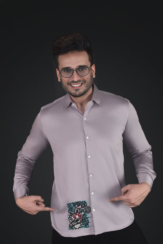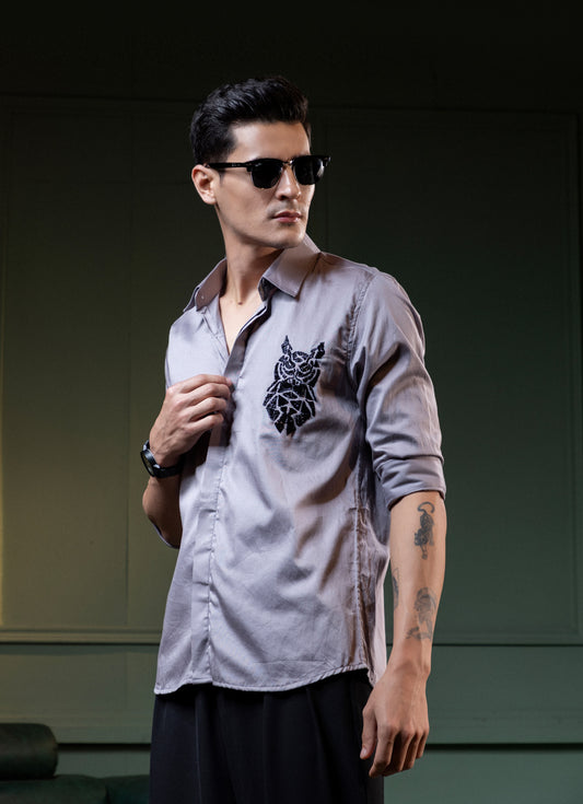 "OWL" EMBROIDERED ON A GRAY SHIRT