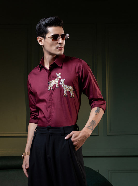 "TWO DEER" EMBROIDERED ON A MAROON SHIRT