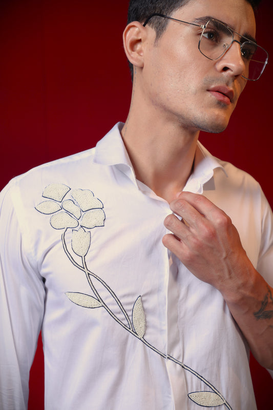 "FLOWER MADE OF PEARLS" EMBROIDERED ON A WHITE SHIRT