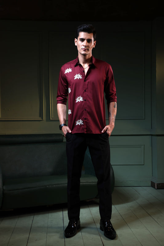 "LOTUS FLOWERS" BEAUTIFULLY EMBROIDRED ON A MAROON SHIRT