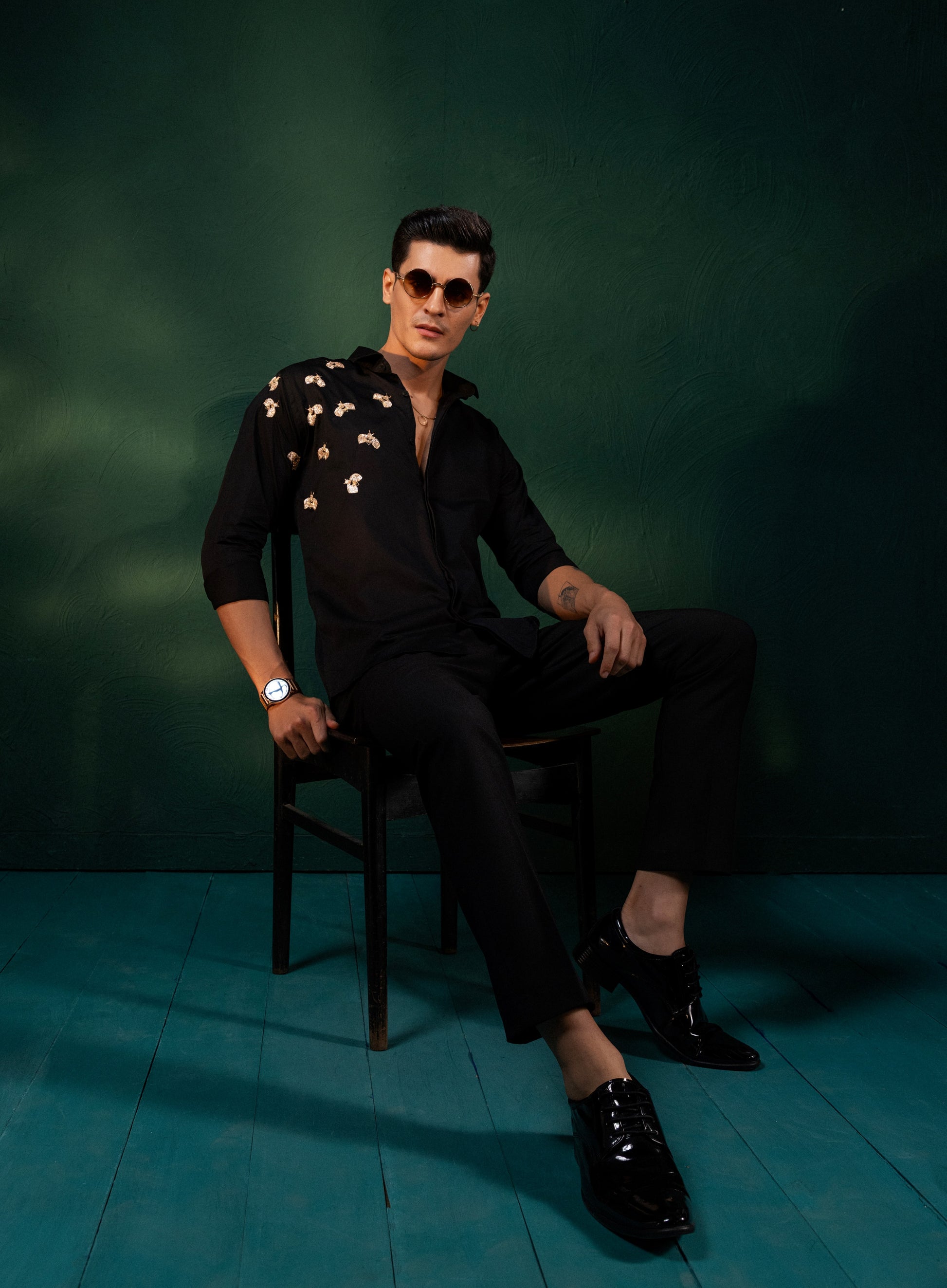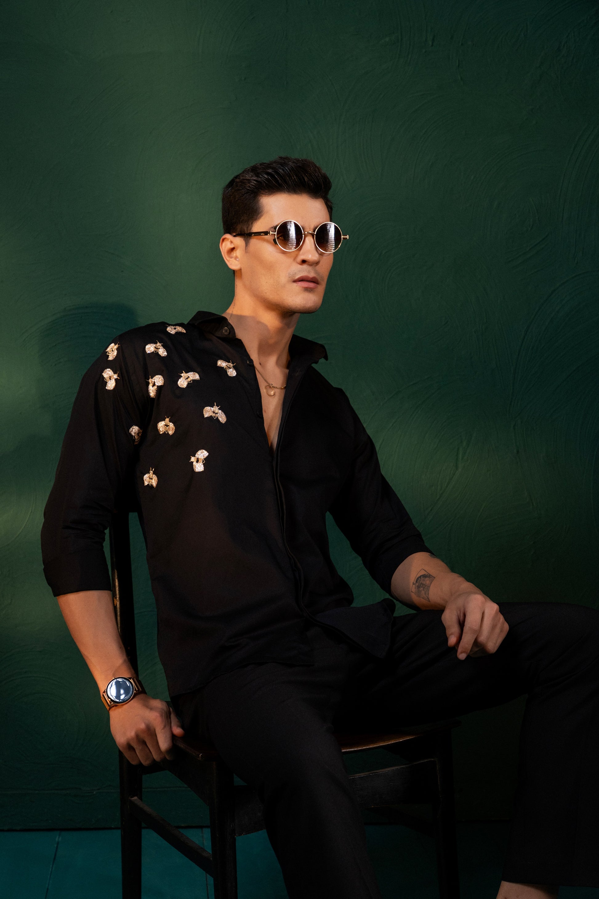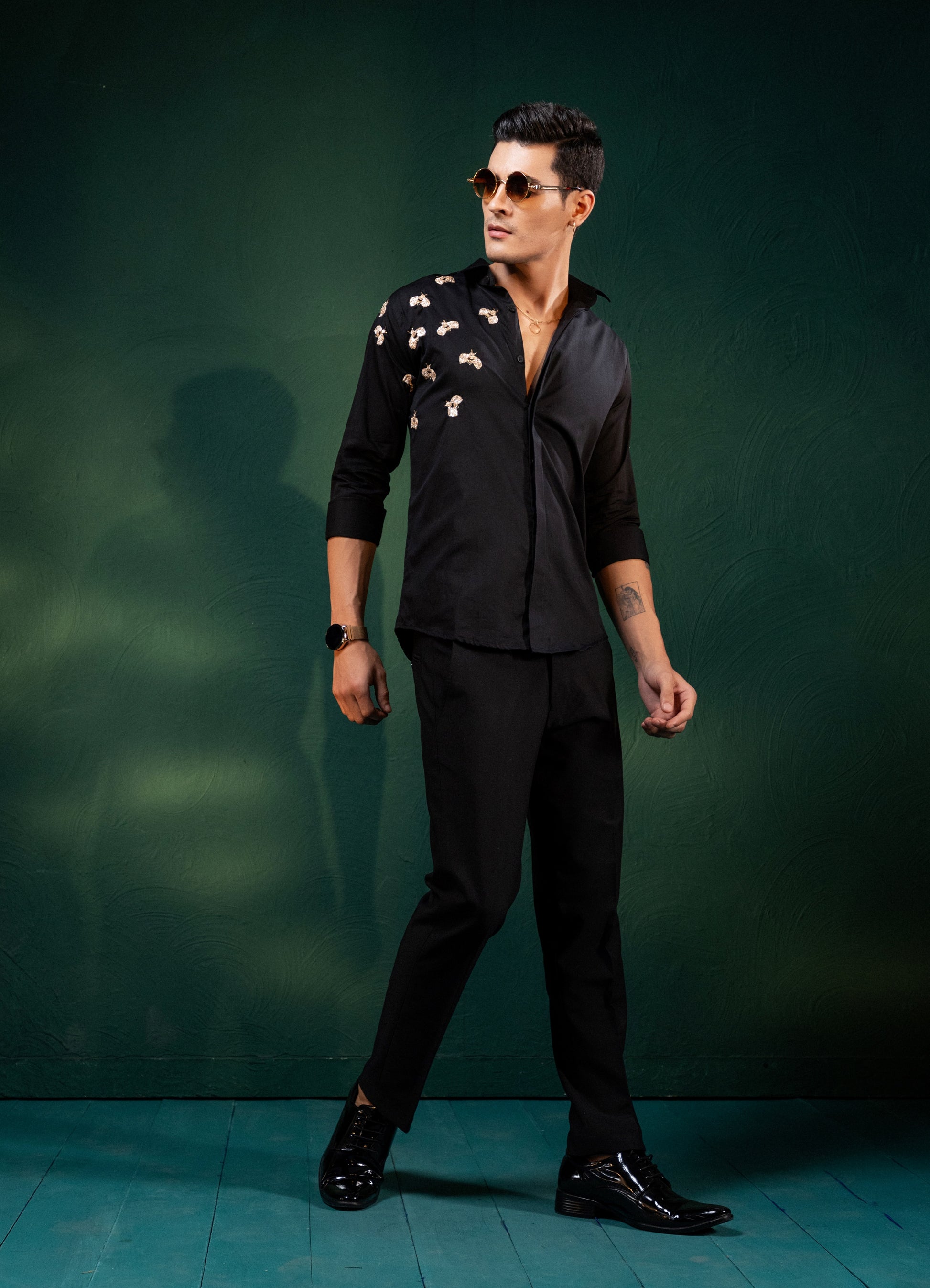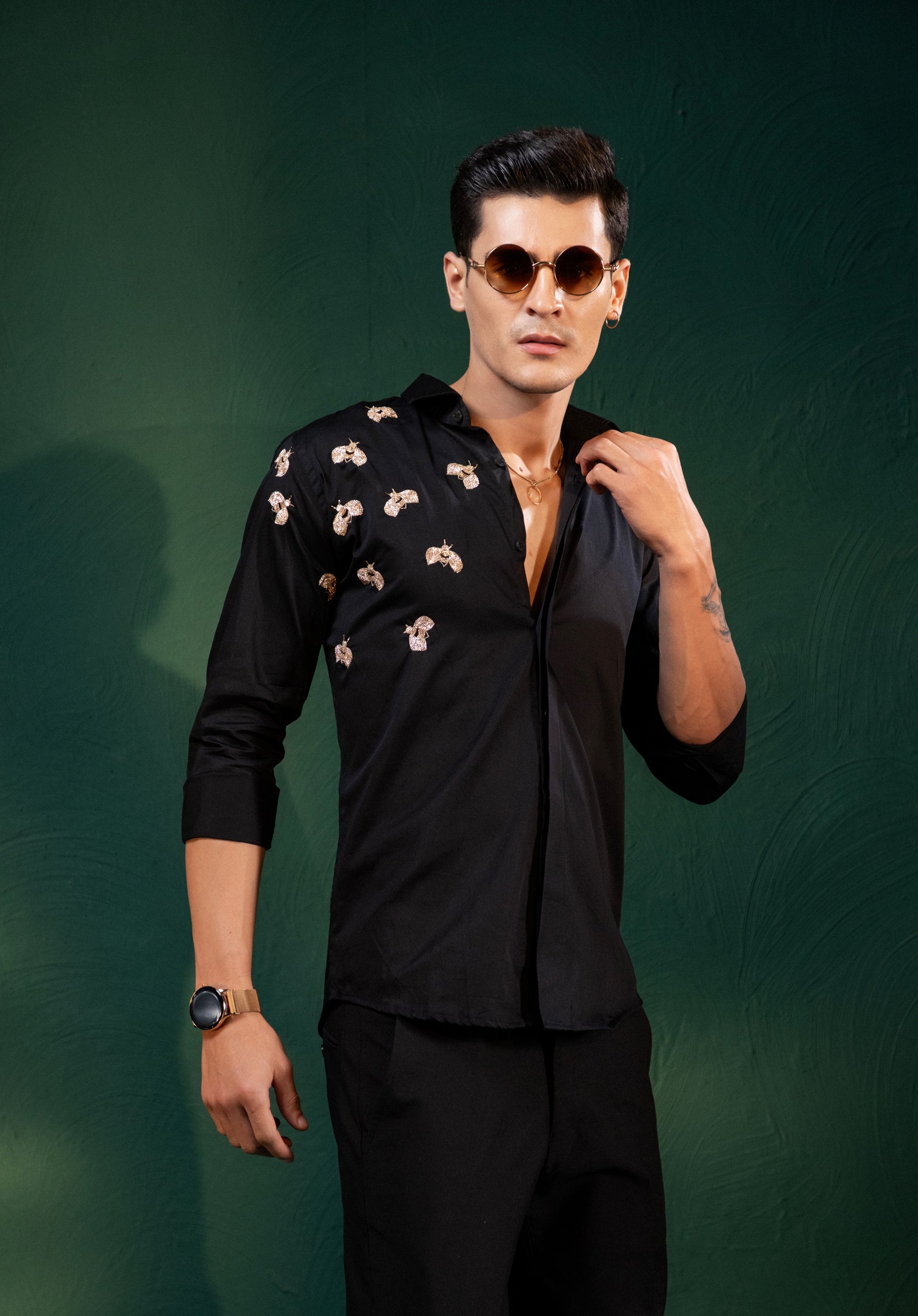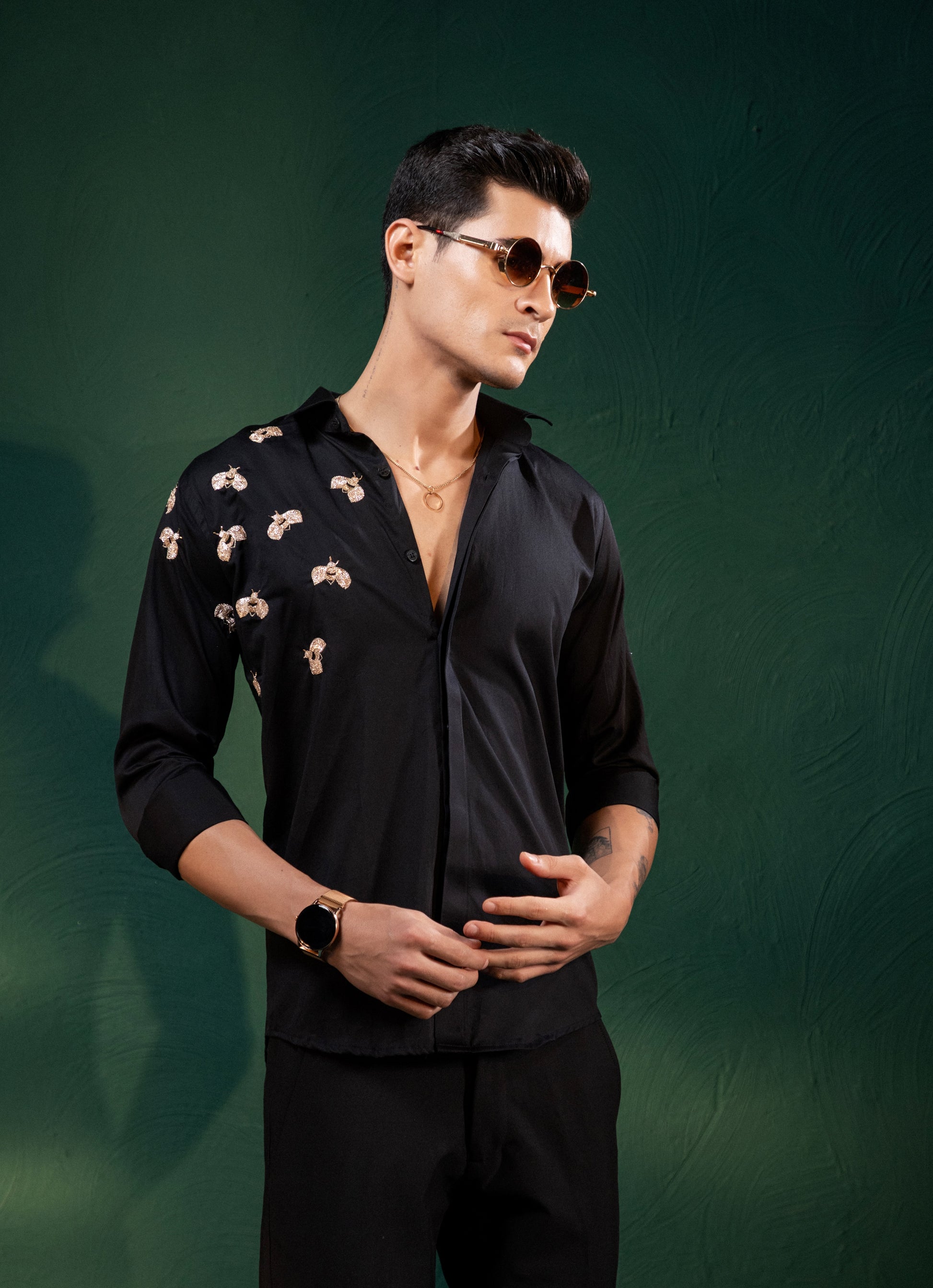 This shirt features beautifully embroidered bees on the front and on sleeves, adding a touch of nature and sophistication to your outfit. Made with high-quality materials, it offers both style and comfort. Upgrade your wardrobe with this unique piece.