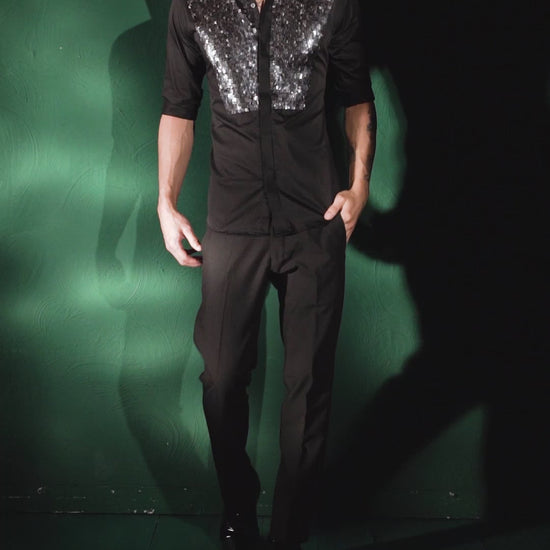 This BLACK SEQUINNED SHIRT is perfect for any formal or special occasion. The all-black design is timeless and versatile, while the sequin detailing adds a touch of elegance and glamour. Made with high-quality materials, this shirt is sure to make you stand out in a crowd.