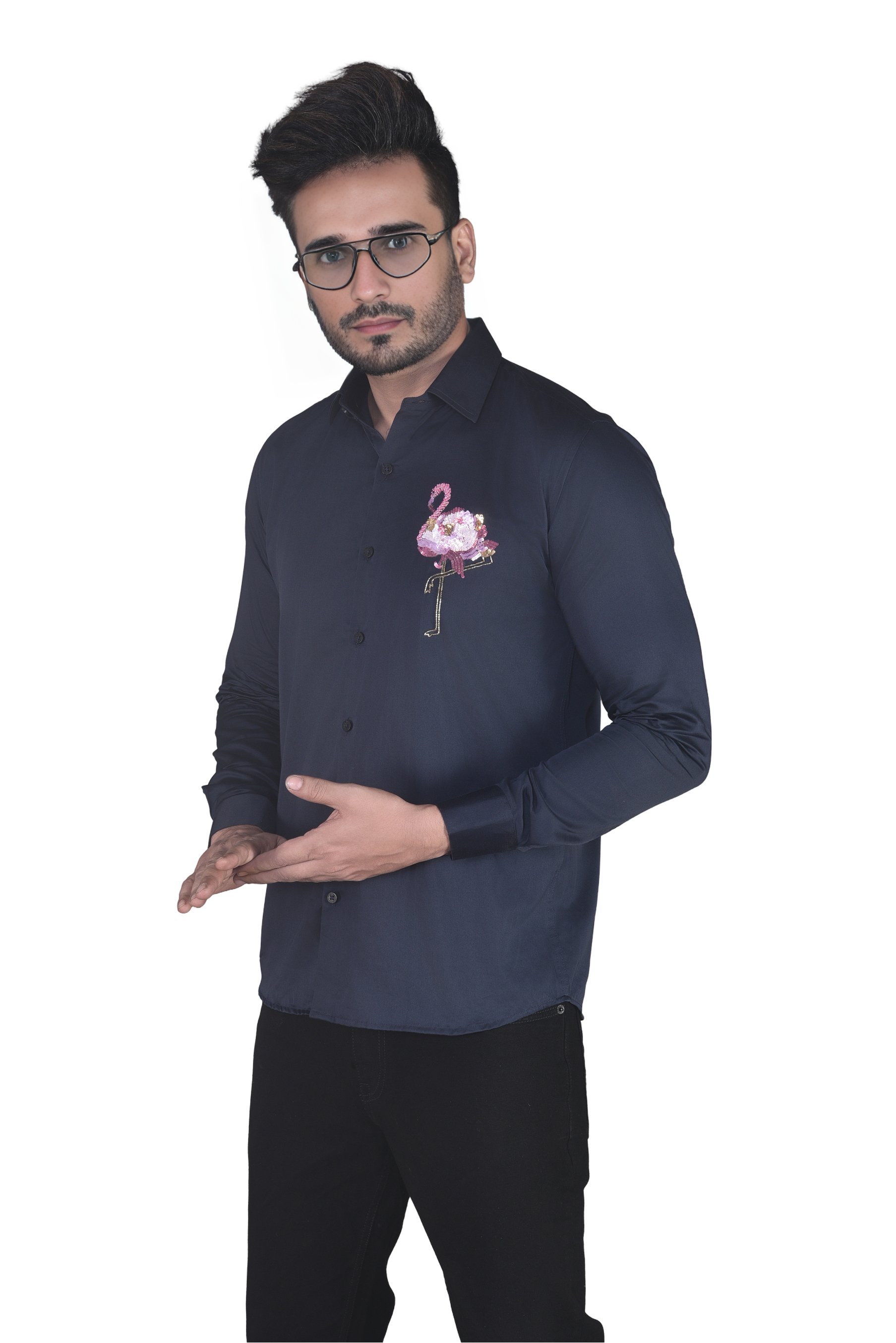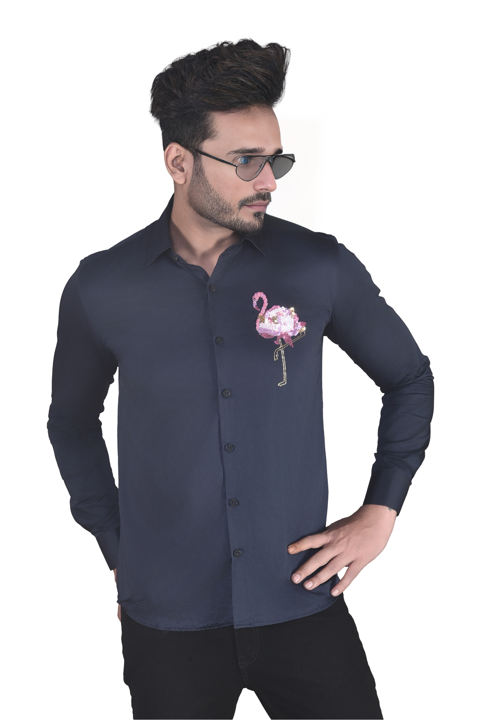 A shirt featuring a flamingo embroidered in navy blue shirt offers a chic and stylish look, combining playful imagery with a sophisticated color palette. The elegant design of the flamingo, often associated with tropical vibes and grace, stands out beautifully against the deep navy background, creating a striking contrast that captures attention. This shirt can be a fun yet fashionable addition to any wardrobe, perfect for summer outings or beach-themed gatherings, while also providing a touch of whimsy and personality to everyday attire.