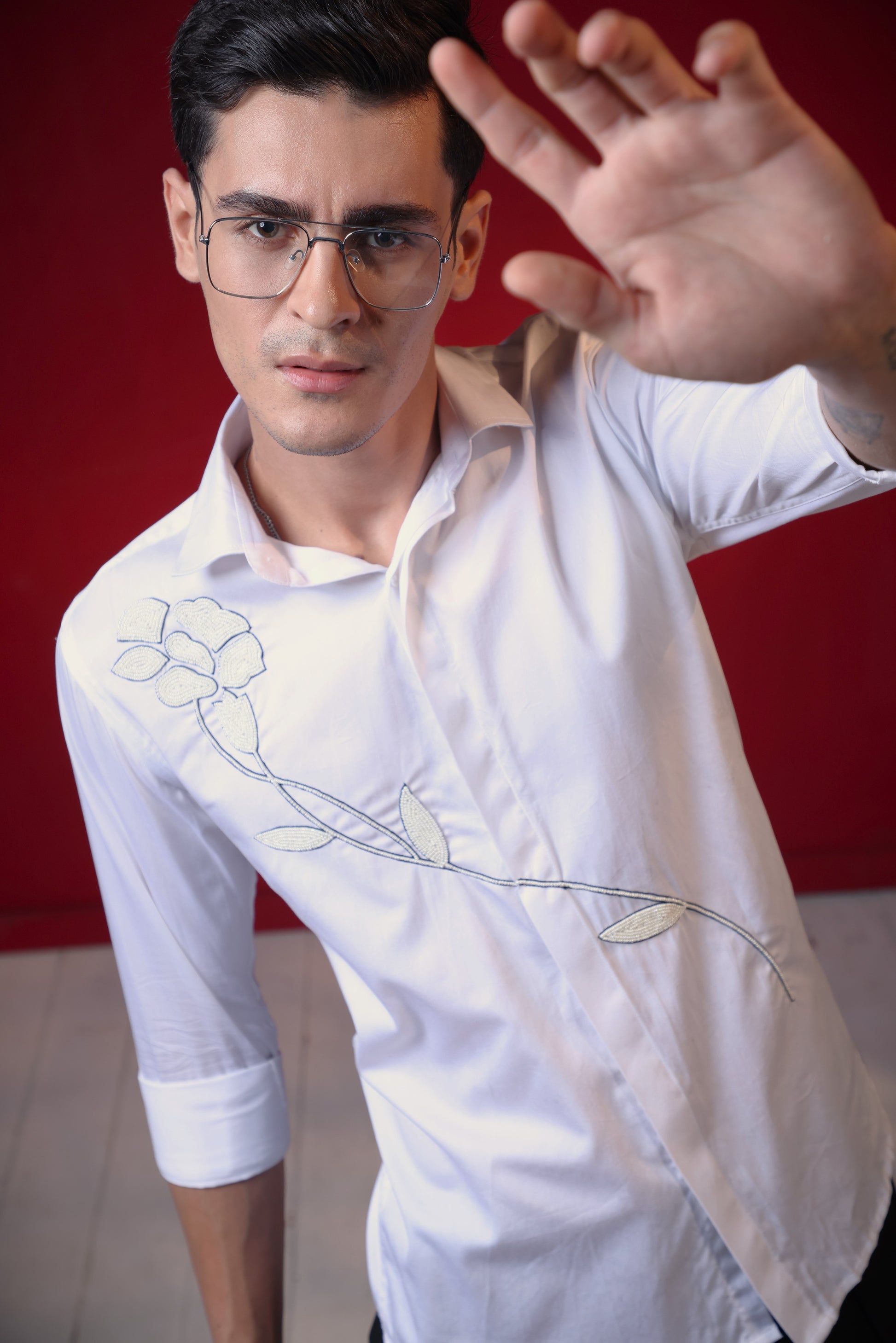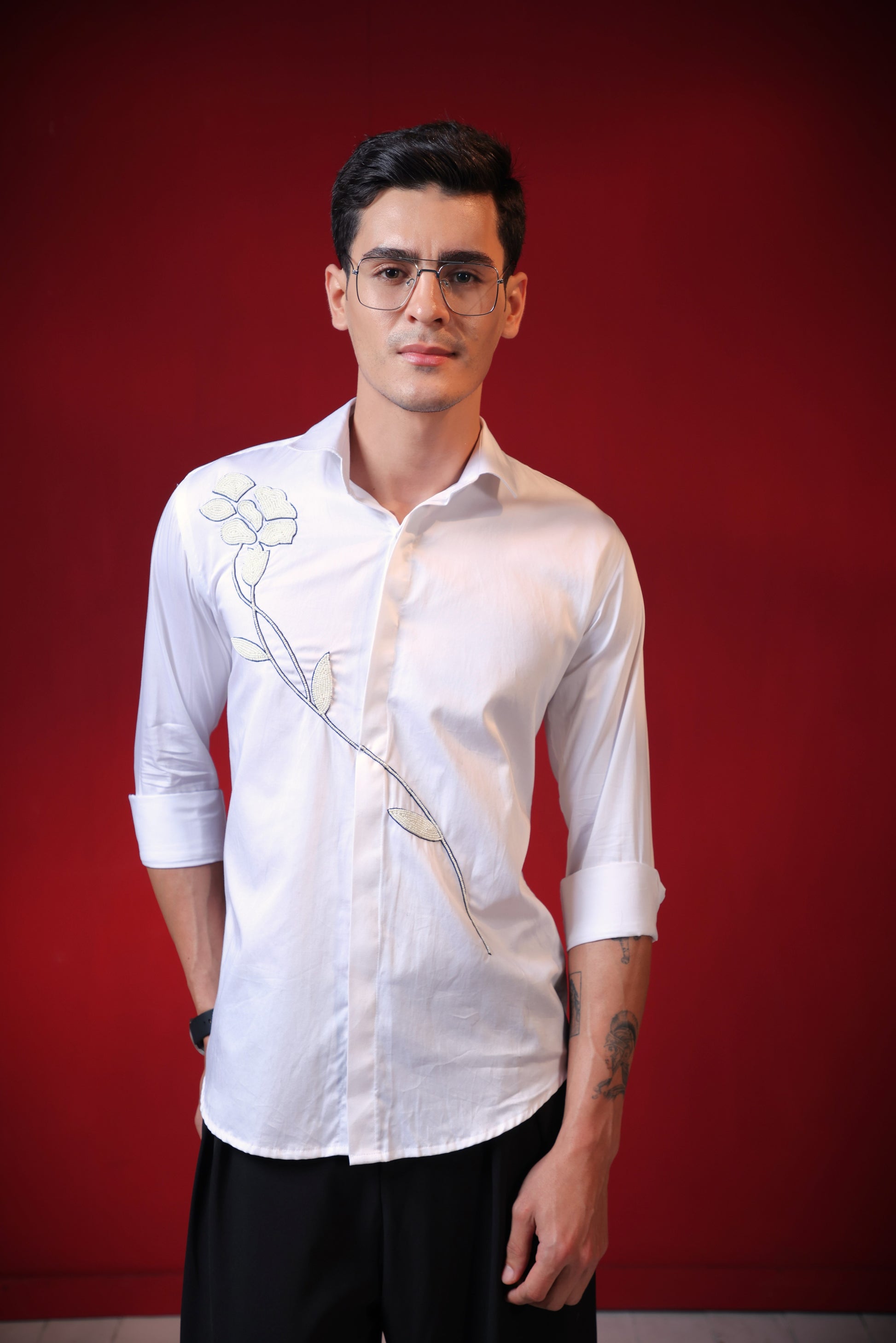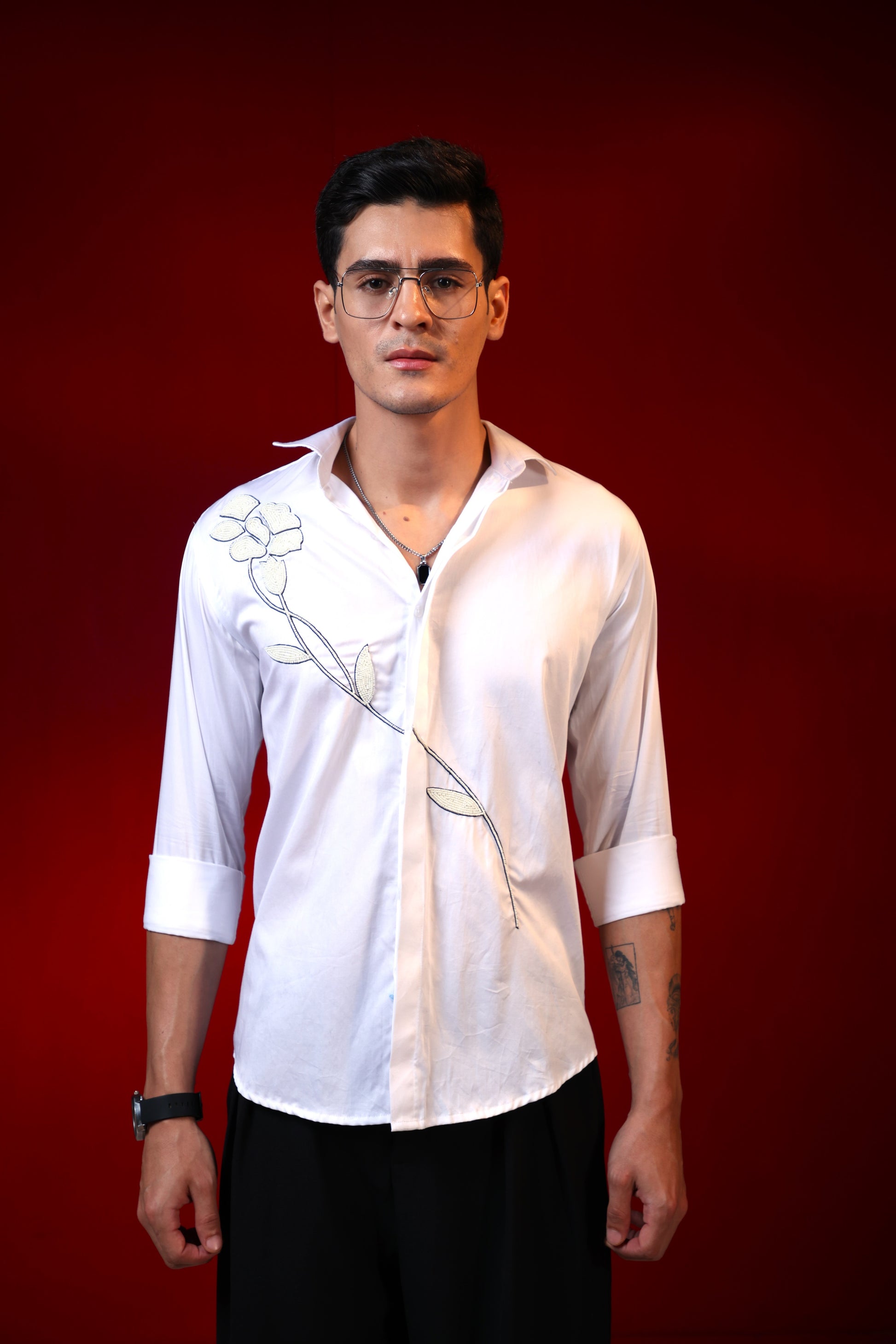 This white shirt showcases a delicately crafted flower made of pearls, adding a touch of elegance and sophistication to your outfit. The embroidered design highlights your unique style and attention to detail. Elevate your wardrobe with this timeless piece.