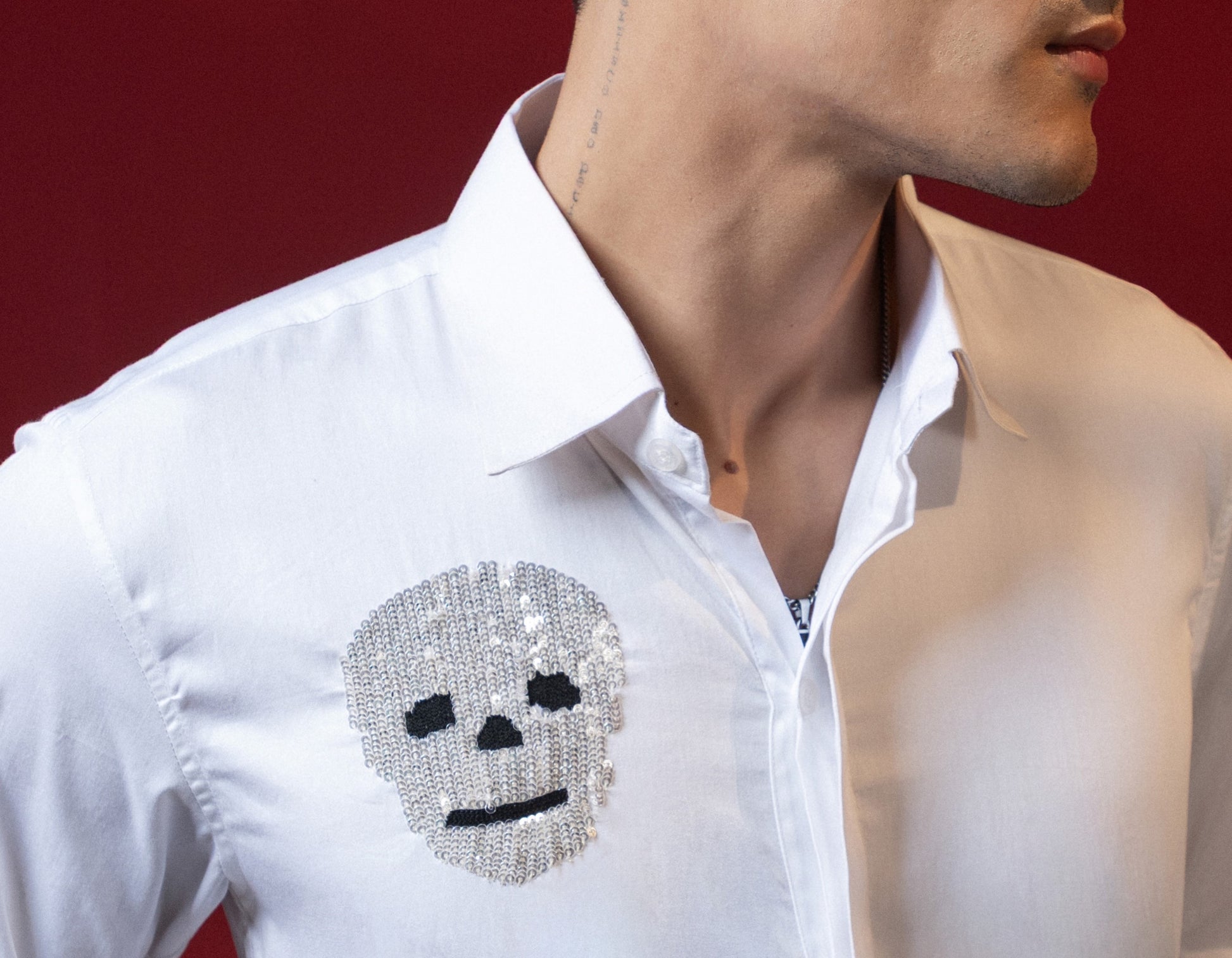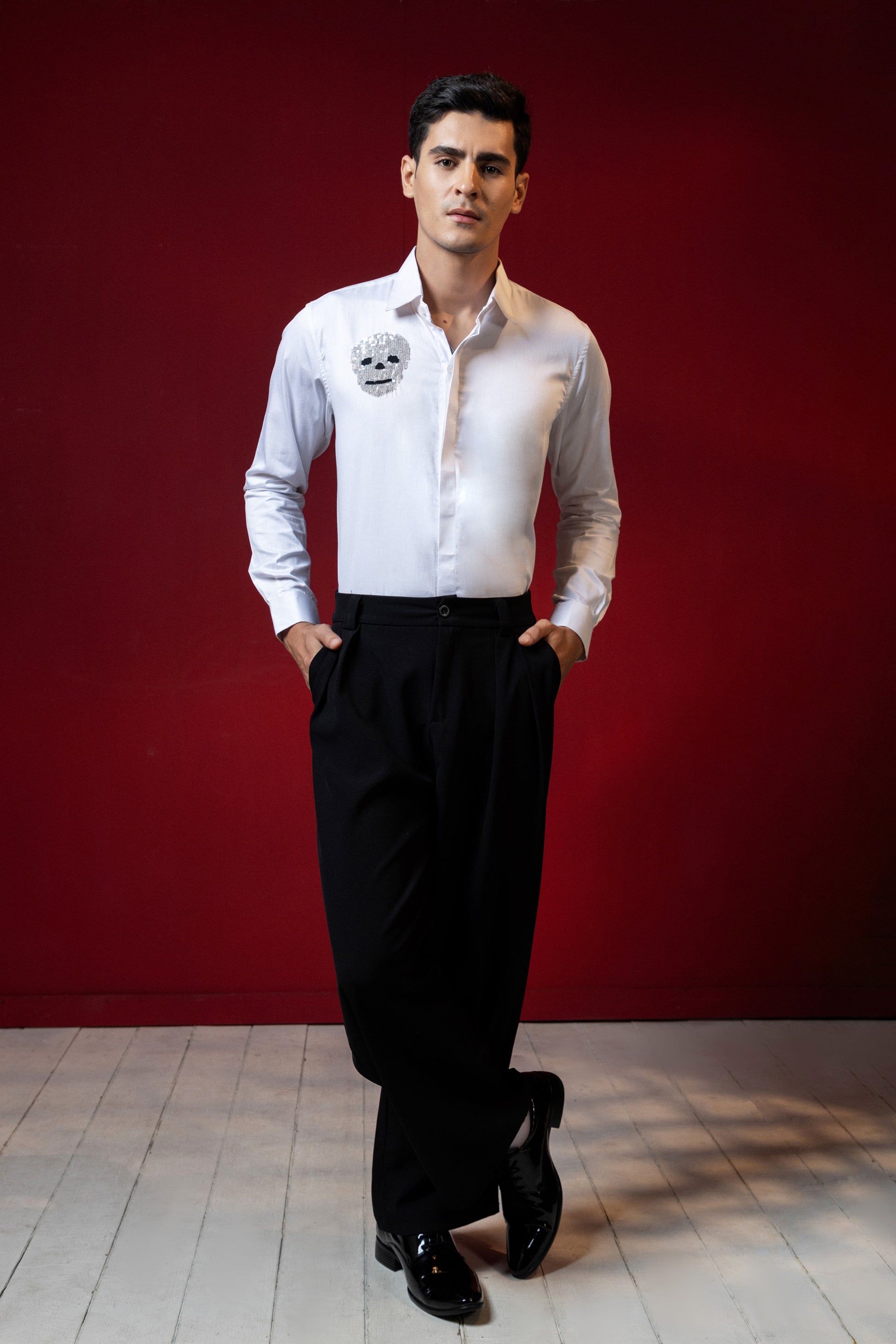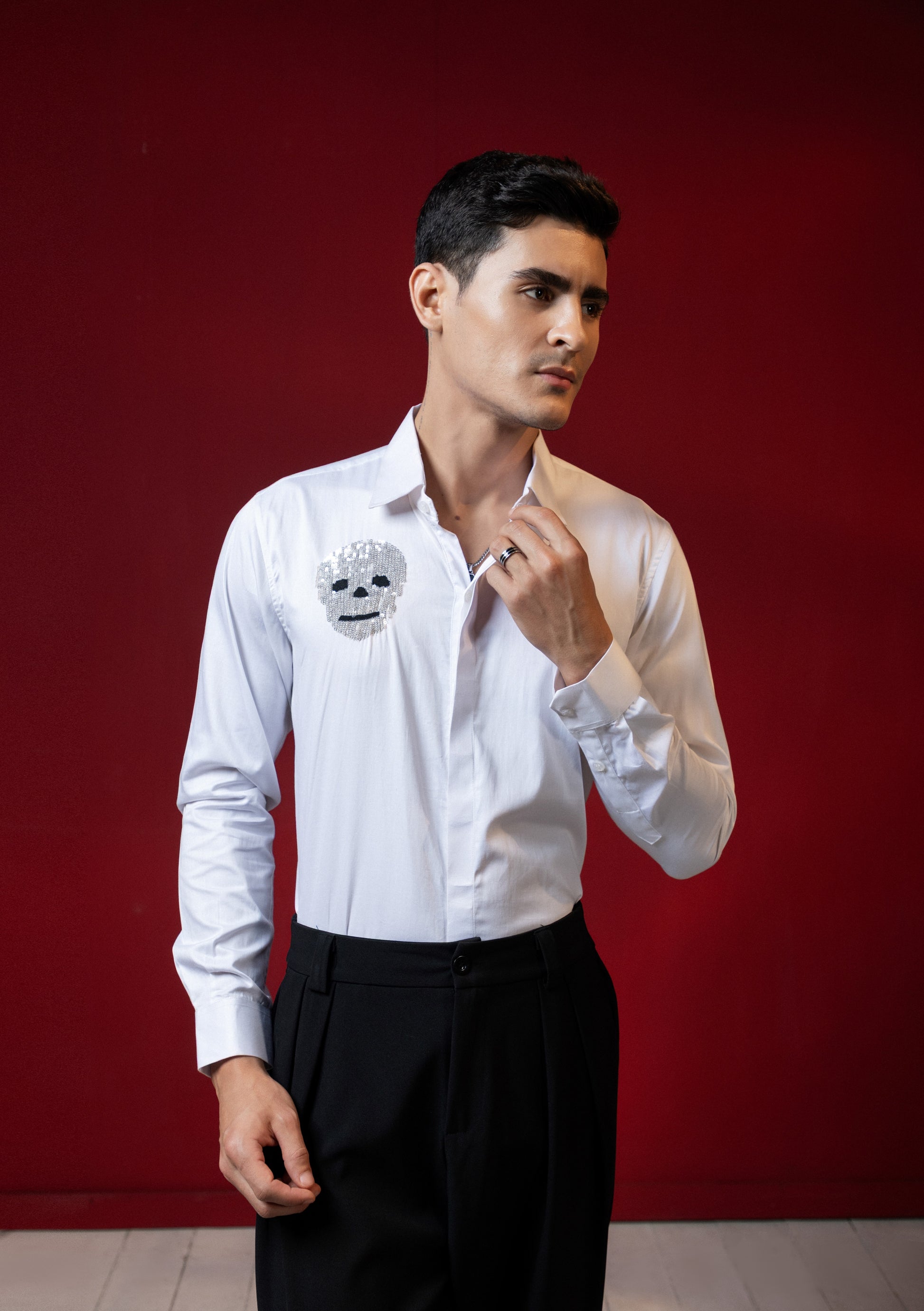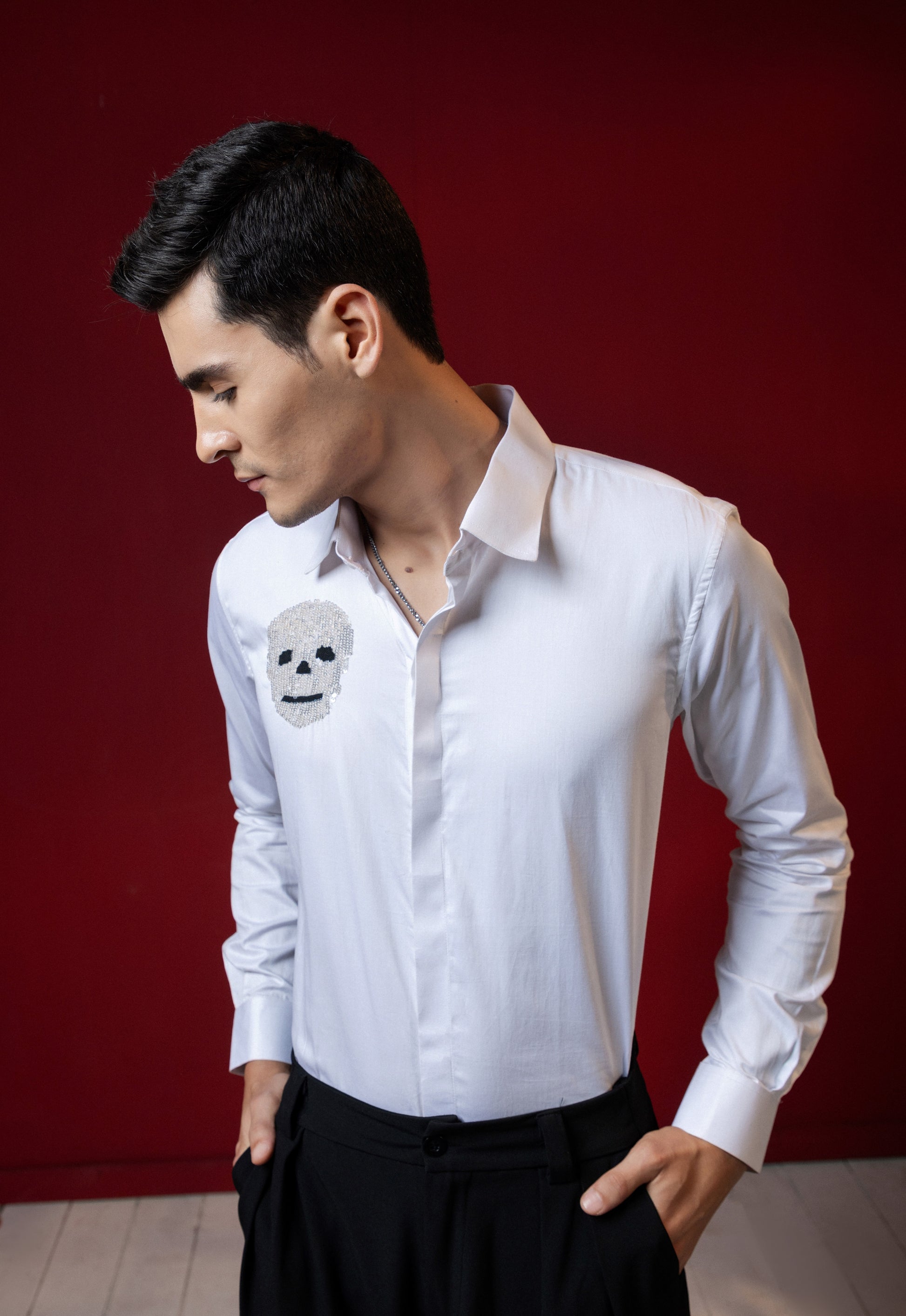 Add a unique touch to your wardrobe with our Funky Skull Embroidered White Shirt. Made with high-quality embroidery, this shirt showcases a bold and edgy design. Elevate your style with this statement piece that is perfect for any occasion.