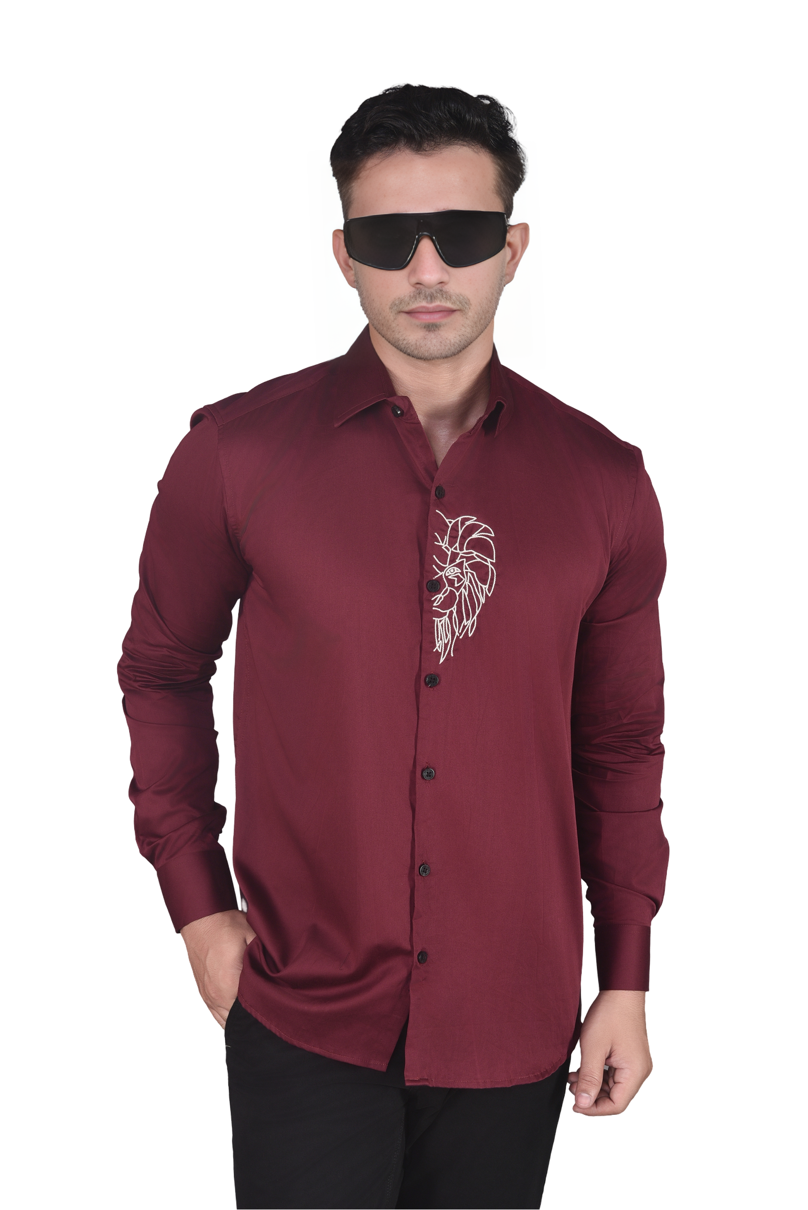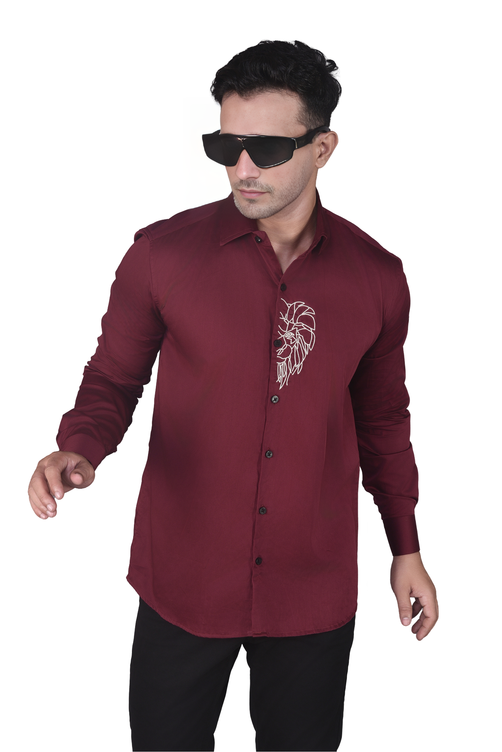 A maroon shirt featuring a half lion face embroidered on it offers a bold and striking aesthetic, blending strength and style in a unique way. The rich maroon hue serves as an excellent backdrop for the intricate lion embroidery, which can be detailed in contrasting colors like gold or cream to highlight its features. This design conveys confidence and fierce individuality, making it an ideal choice for those looking to make a statement. Whether worn casually or for a night out, this shirt showcases a blend of artistry and personal expression that appeals to animal lovers and fashion enthusiasts alike.