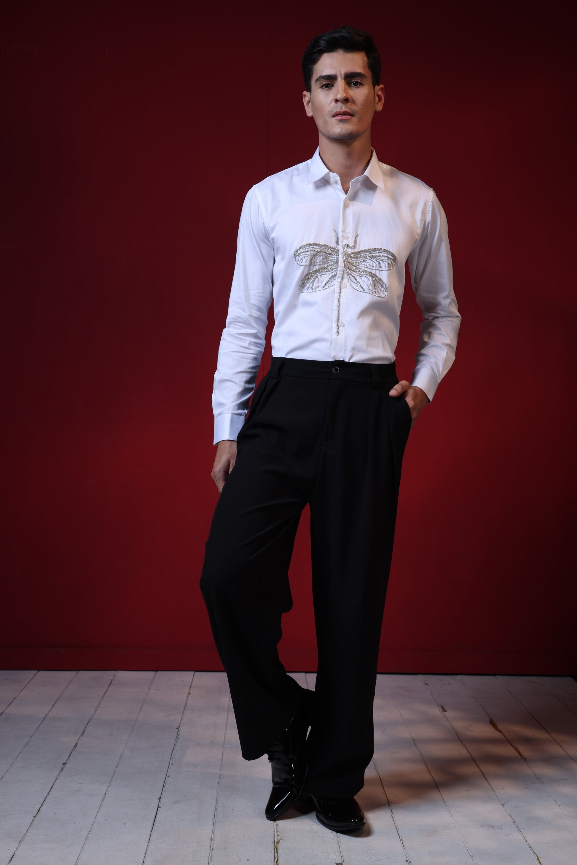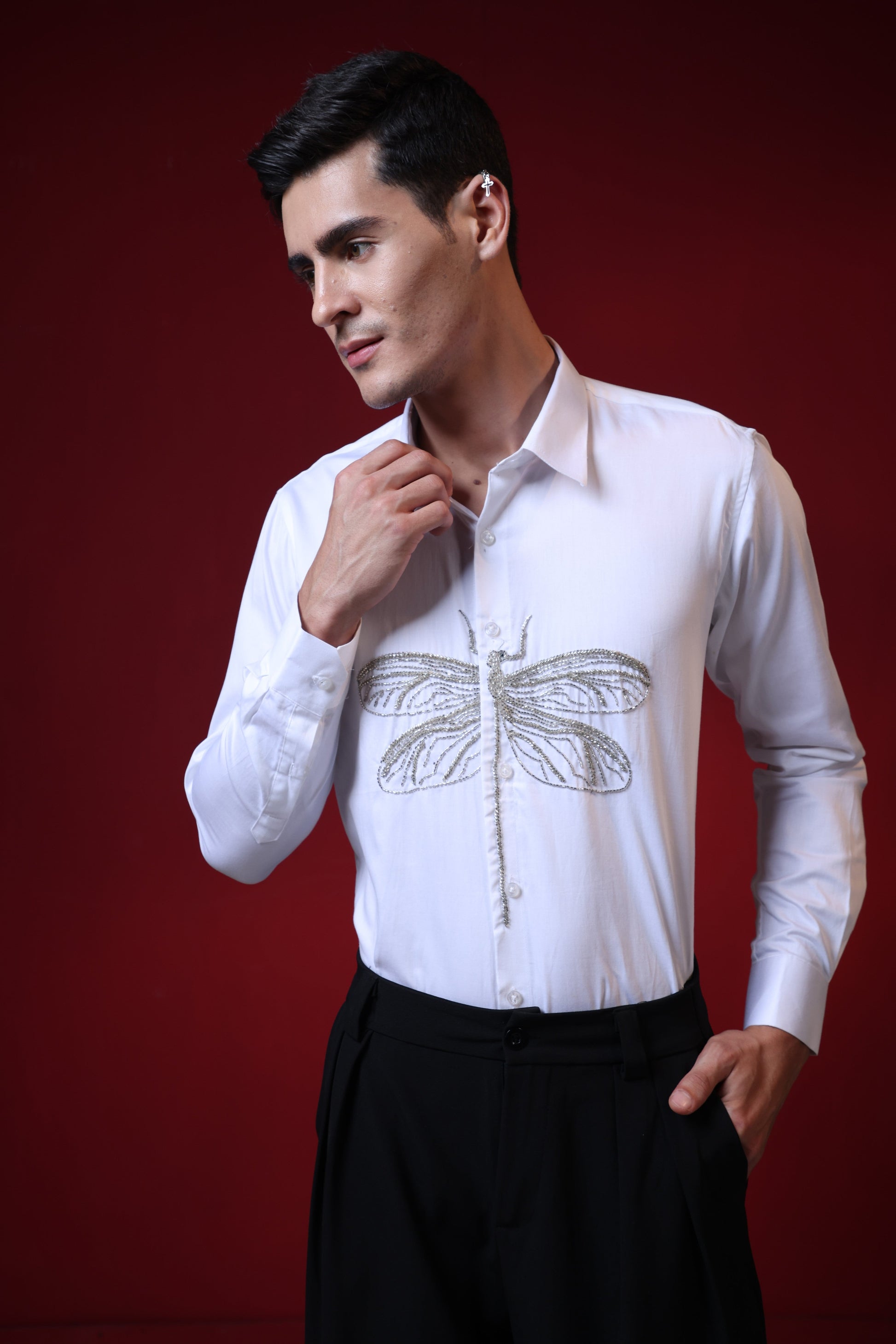 Introducing our stunning white shirt adorned with a beautifully hand-embroidered dragonfly design, which adds a touch of whimsy and elegance to your wardrobe. Crafted from premium, soft fabric, this shirt not only ensures comfort but also showcases exquisite craftsmanship with intricate details in the dragonfly embroidery. Perfect for both casual outings and dressier occasions, it can be effortlessly paired with jeans or tailored trousers. This unique piece is ideal for those seeking to express their individuality while maintaining a sophisticated aesthetic. Embrace your style with this charming and artistic shirt!