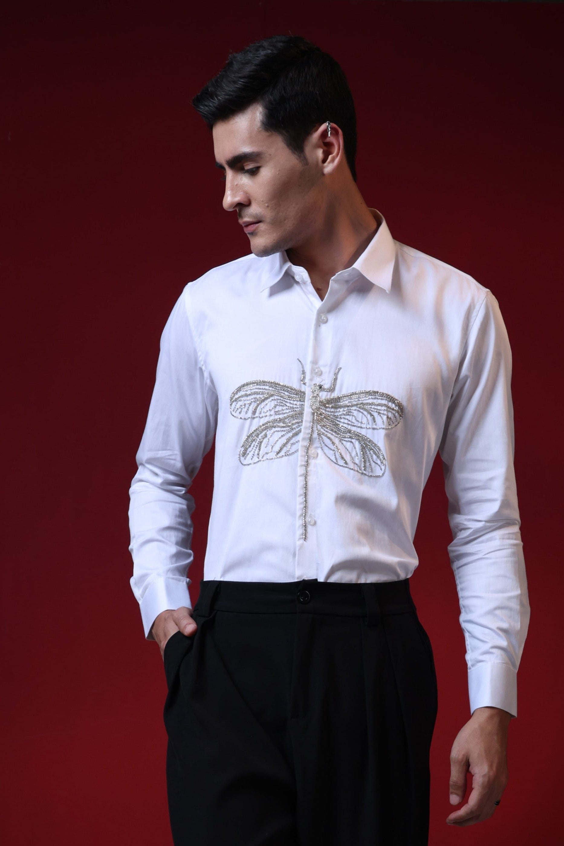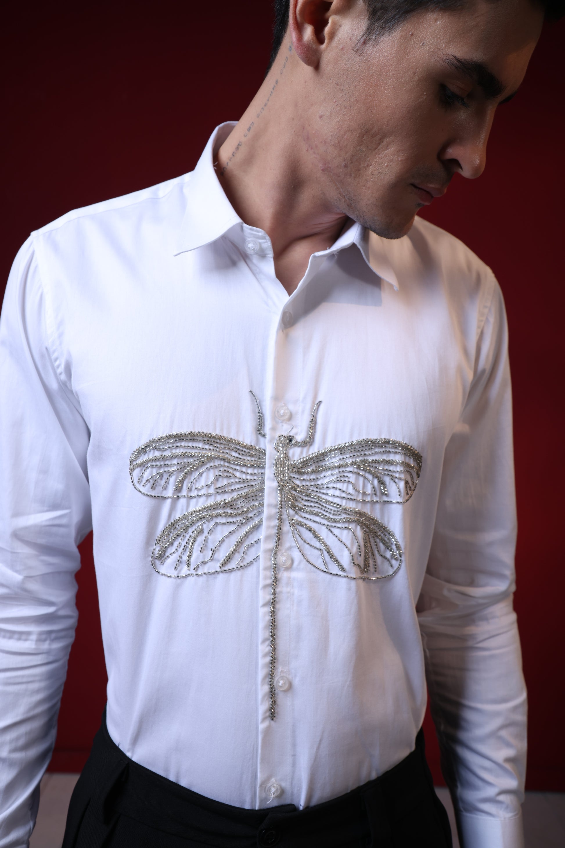 "HAND EMBROIDERED DRAGON FLY IN A WHITE SHIRT"