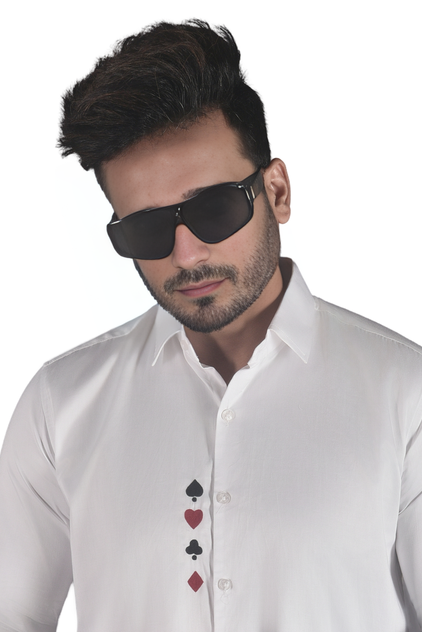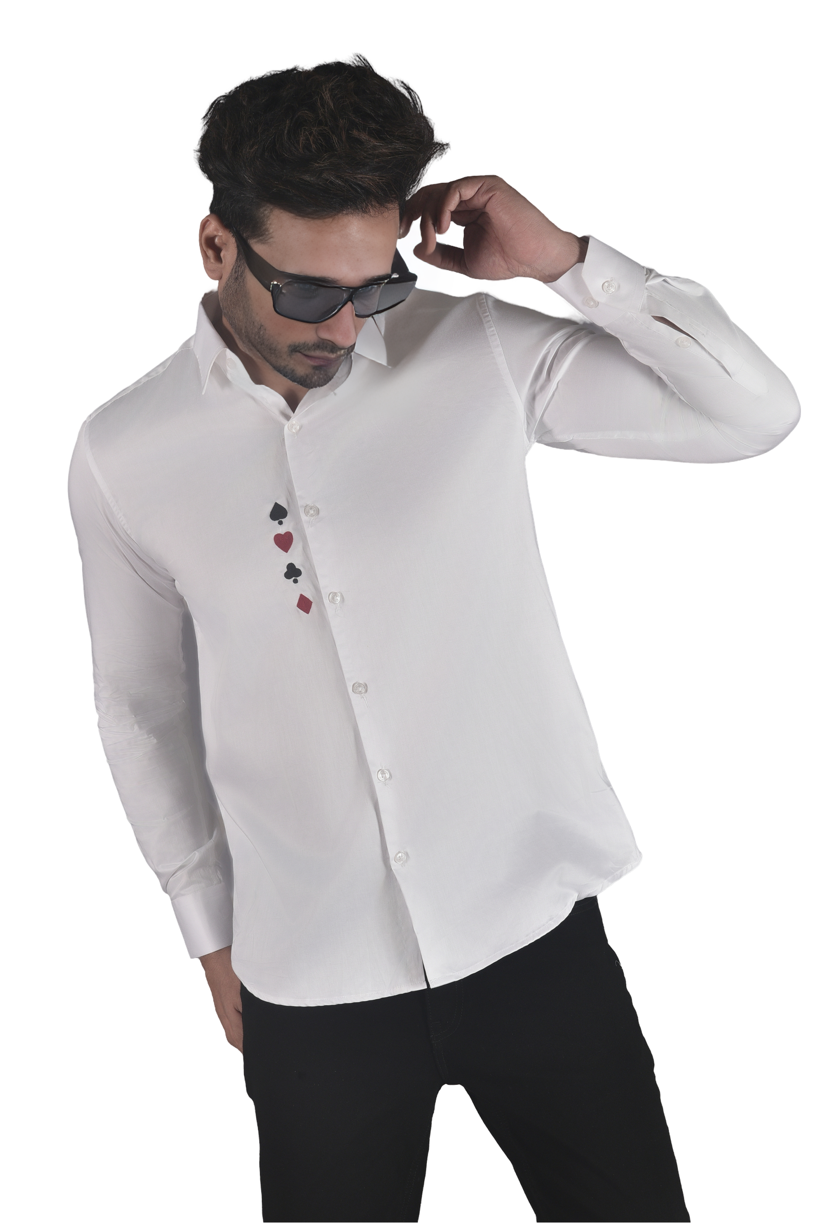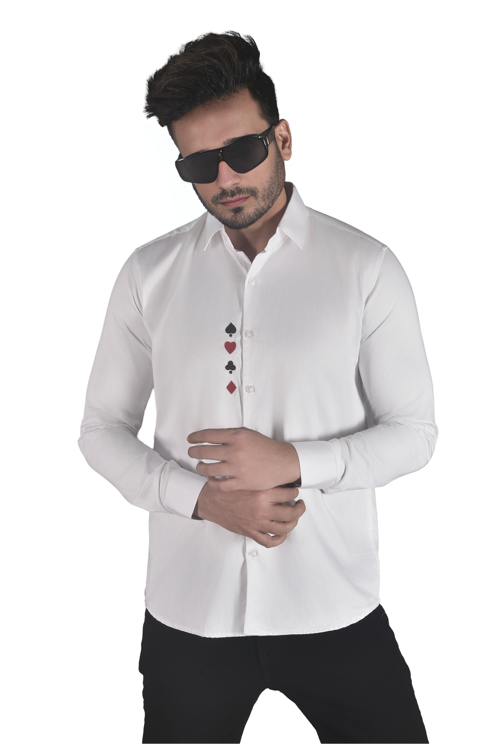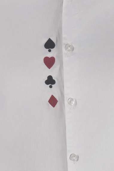 The hand-made embroidery featuring playing cards on a white fabric creates a chic and whimsical aesthetic for any garment or accessory. This design intricately depicts various card motifs, such as hearts, spades, diamonds, and clubs, which can add a fun yet sophisticated flair to items like shirts, jackets. The white background enhances the vibrancy of the thread work, making the cards stand out elegantly. Ideal for those who appreciate a playful nod to classic games while enjoying unique, handcrafted fashion.