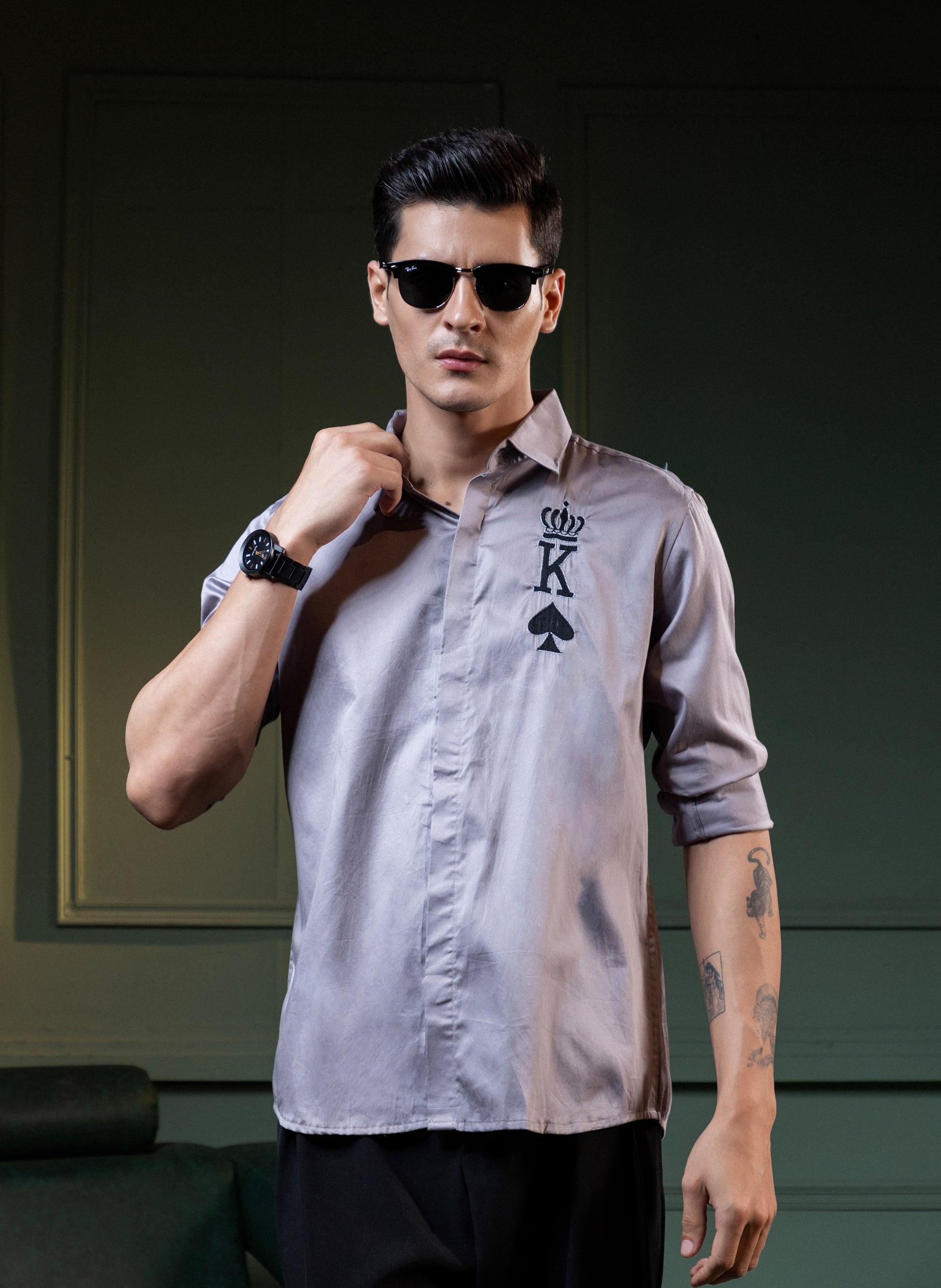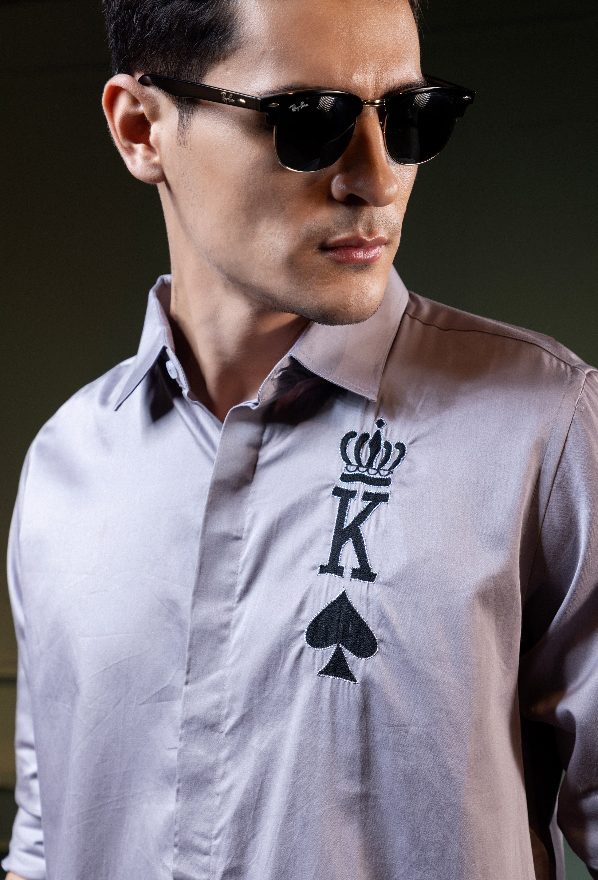 "KING OF SPADES" EMBROIDERED ON A GRAY SHIRT