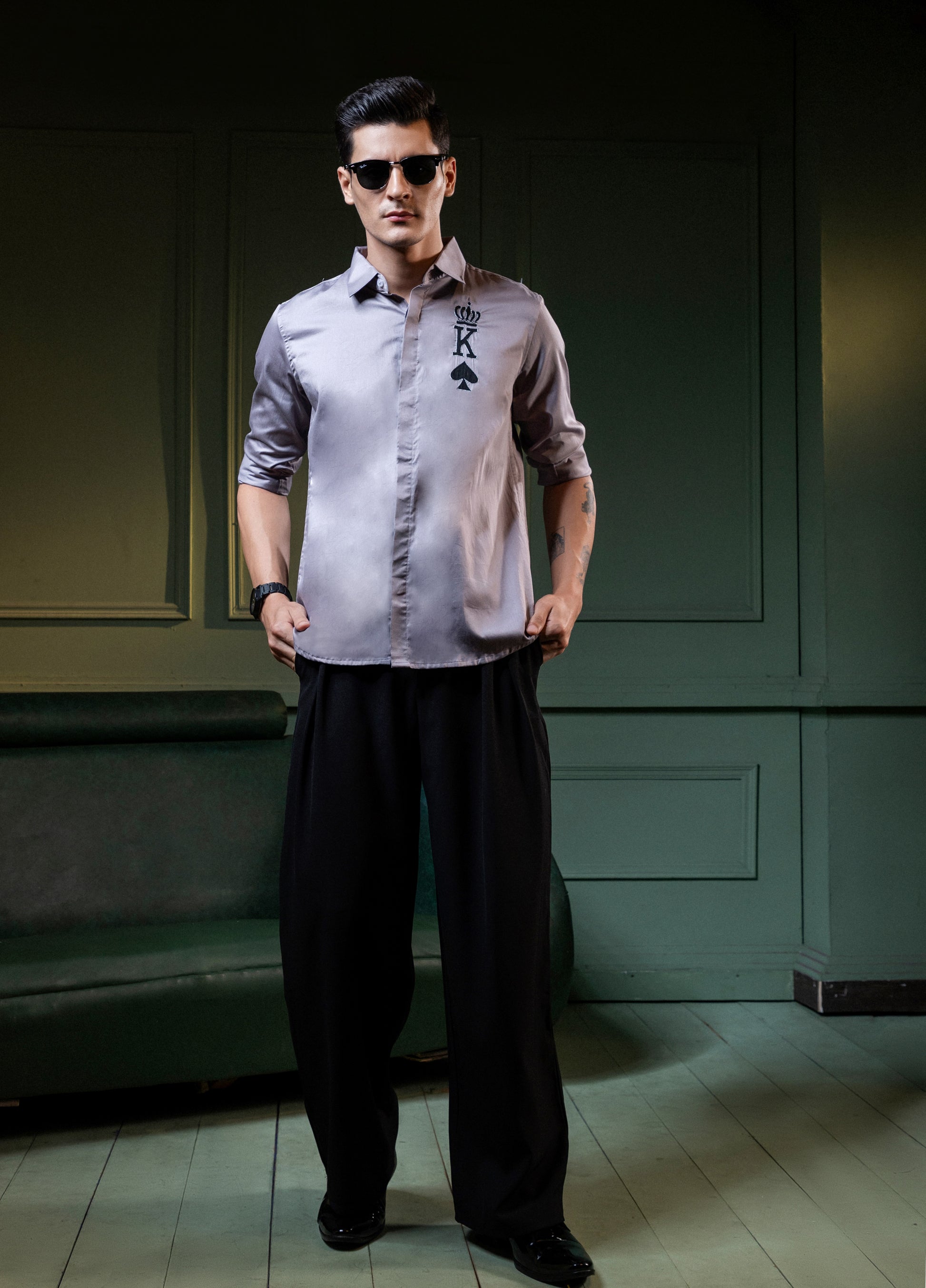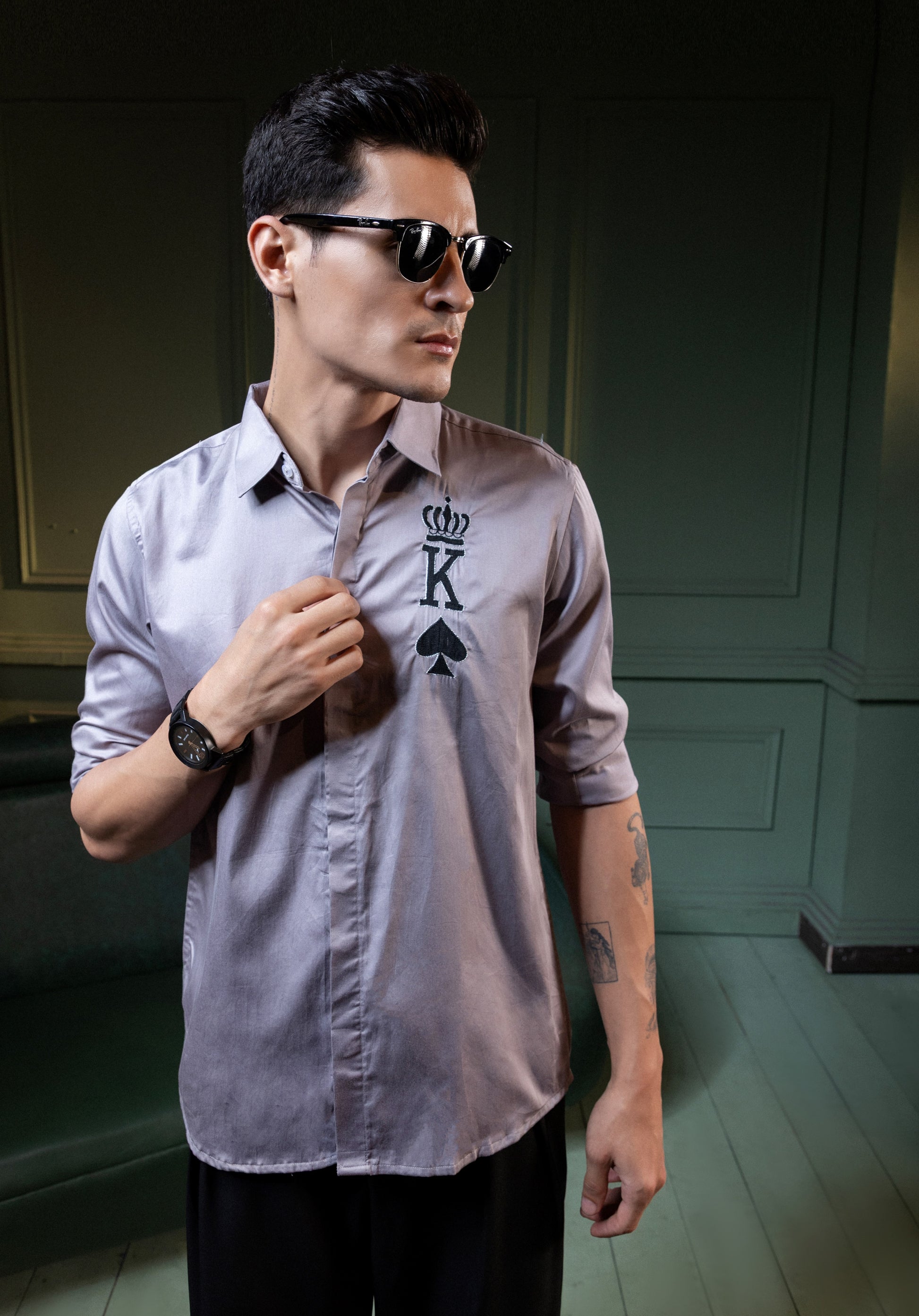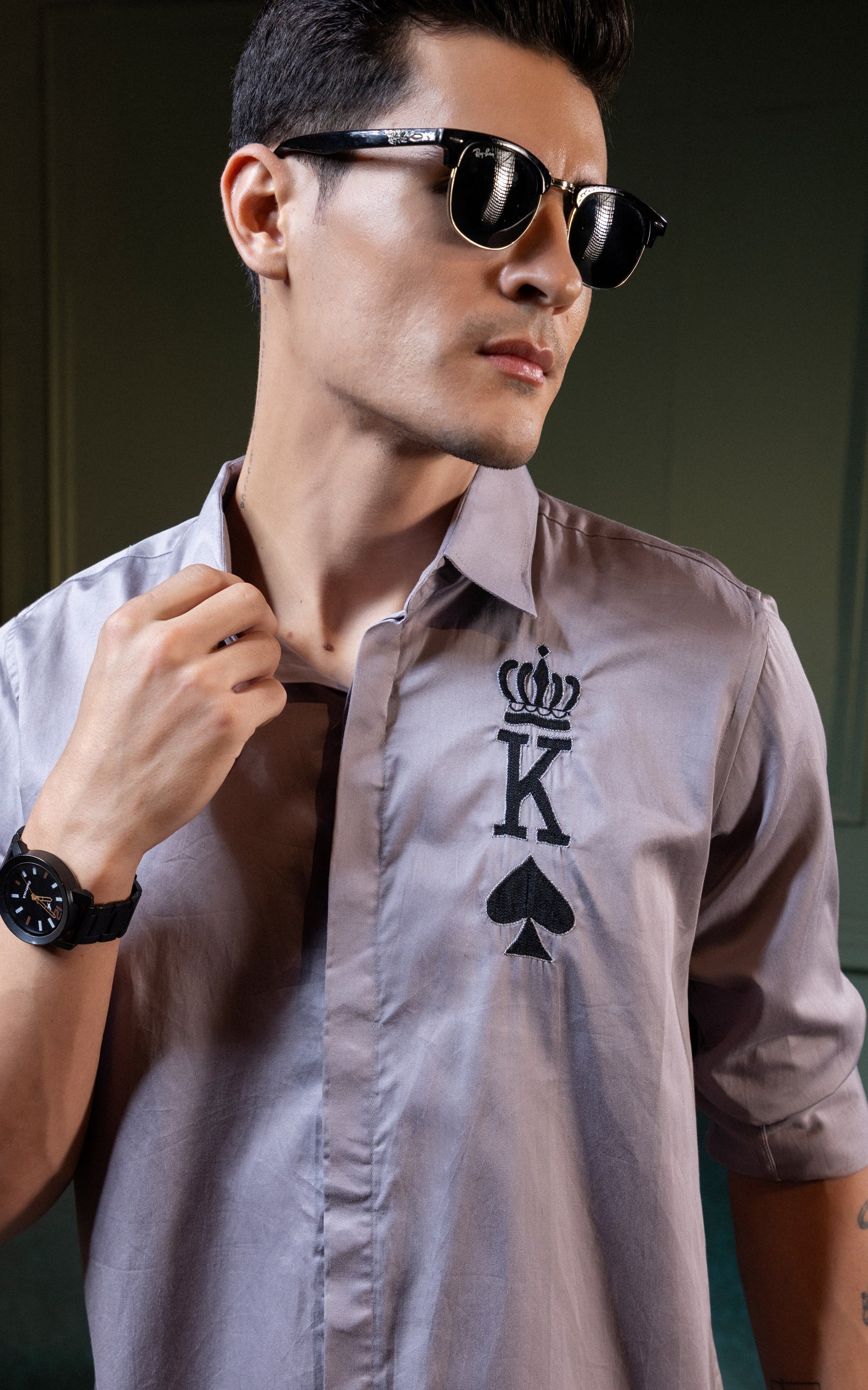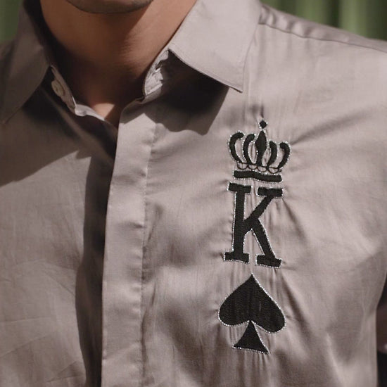 Show off your regal style with our King of Spades embroidered gray shirt. Made with high-quality gray fabric, this shirt features a detailed embroidered design of the King of Spades, making it perfect for any card game enthusiast or anyone looking to add some sophistication to their wardrobe. Rule the fashion game with our King of Spades shirt.