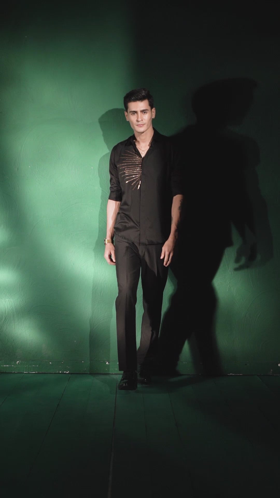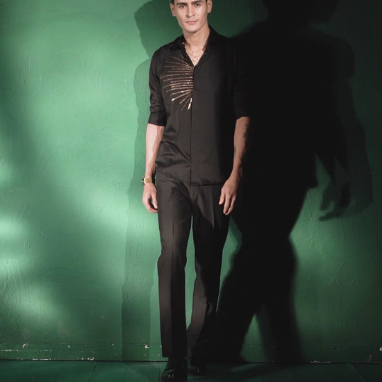 This black shirt features a unique line pattern embroidered throughout, adding a touch of sophistication to your wardrobe. Crafted with precision and attention to detail, this shirt is sure to make a statement wherever you go. Elevate your style with this expertly designed piece.