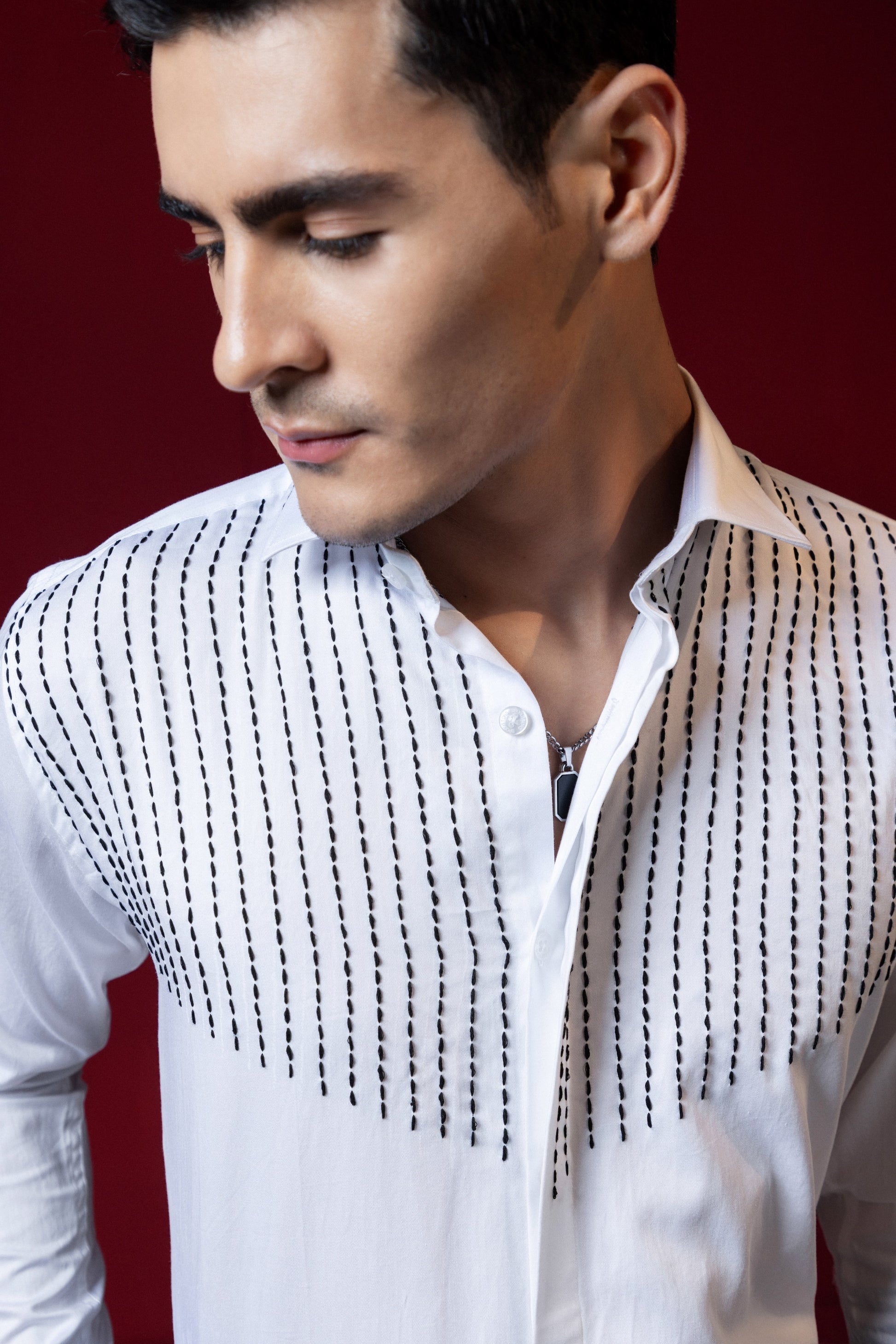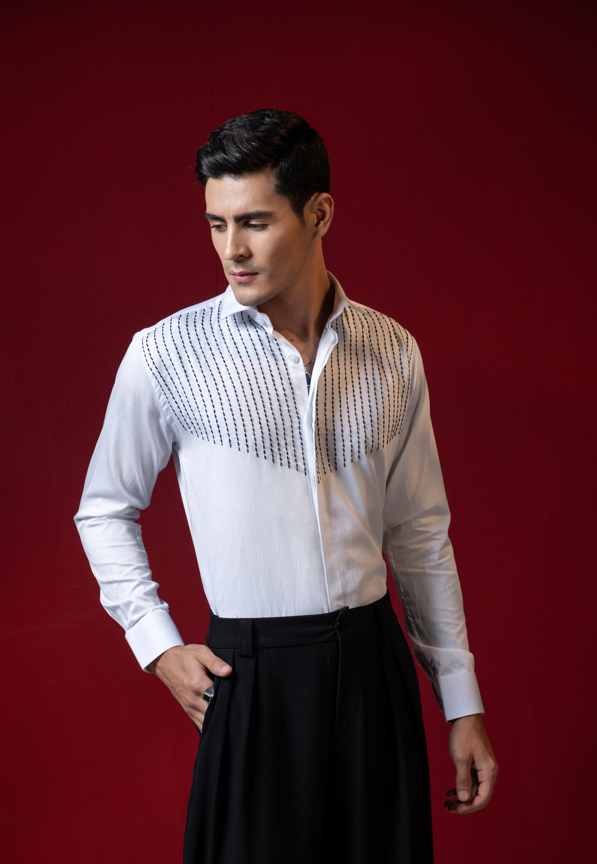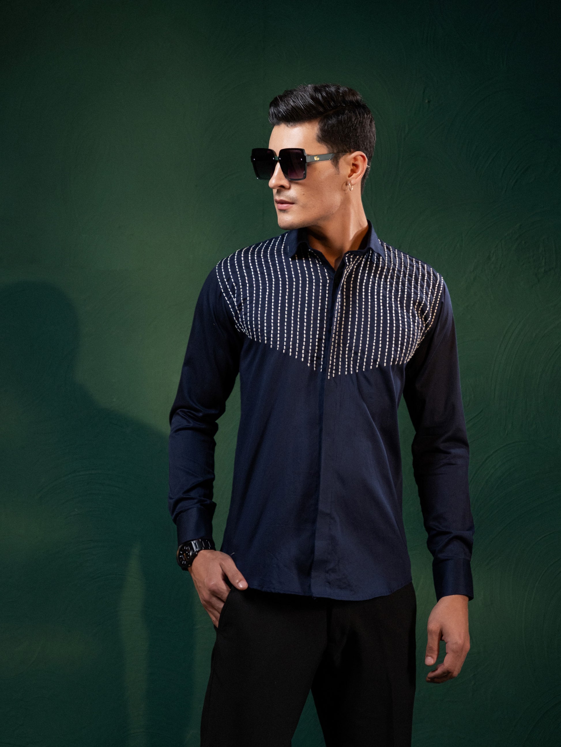 Expertly crafted with precision, each line of thread on this shirt is carefully embroidered to create a unique and stylish design. Elevate your wardrobe with this expertly designed shirt, perfect for any occasion. Experience the quality and elegance of this intricate embroidery, made to stand out in any crowd.