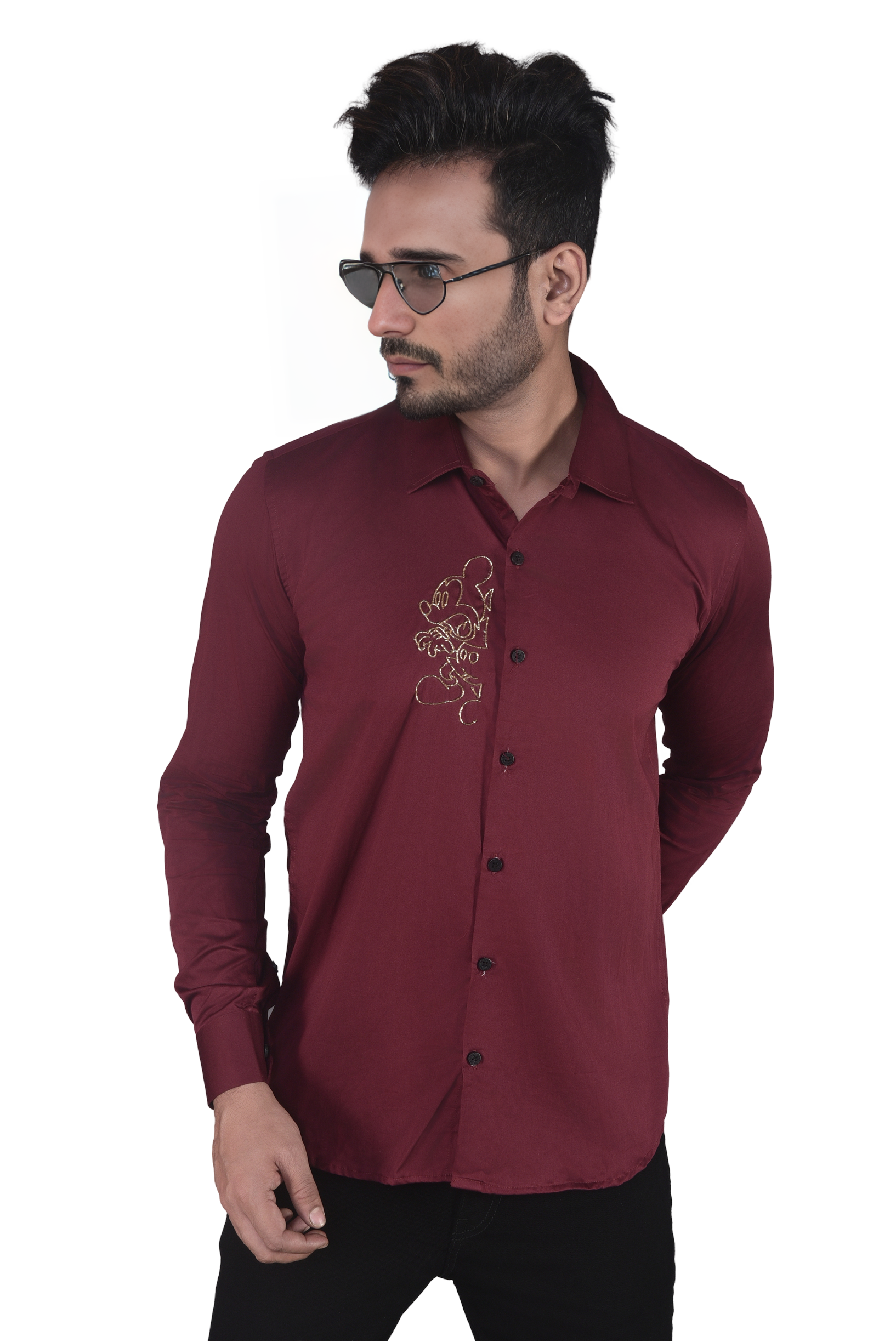 A maroon shirt featuring an embroidered Mickey Mouse adds a playful and nostalgic touch to any outfit. The rich maroon color provides a unique twist on the classic Disney character, making it a stylish choice for fans of all ages. The detailed stitching captures Mickey's iconic features, lending charm and whimsy to the shirt. Perfect for casual wear or showcasing personality at themed gatherings, this piece effortlessly blends fun with fashion, making it a delightful addition to any wardrobe.