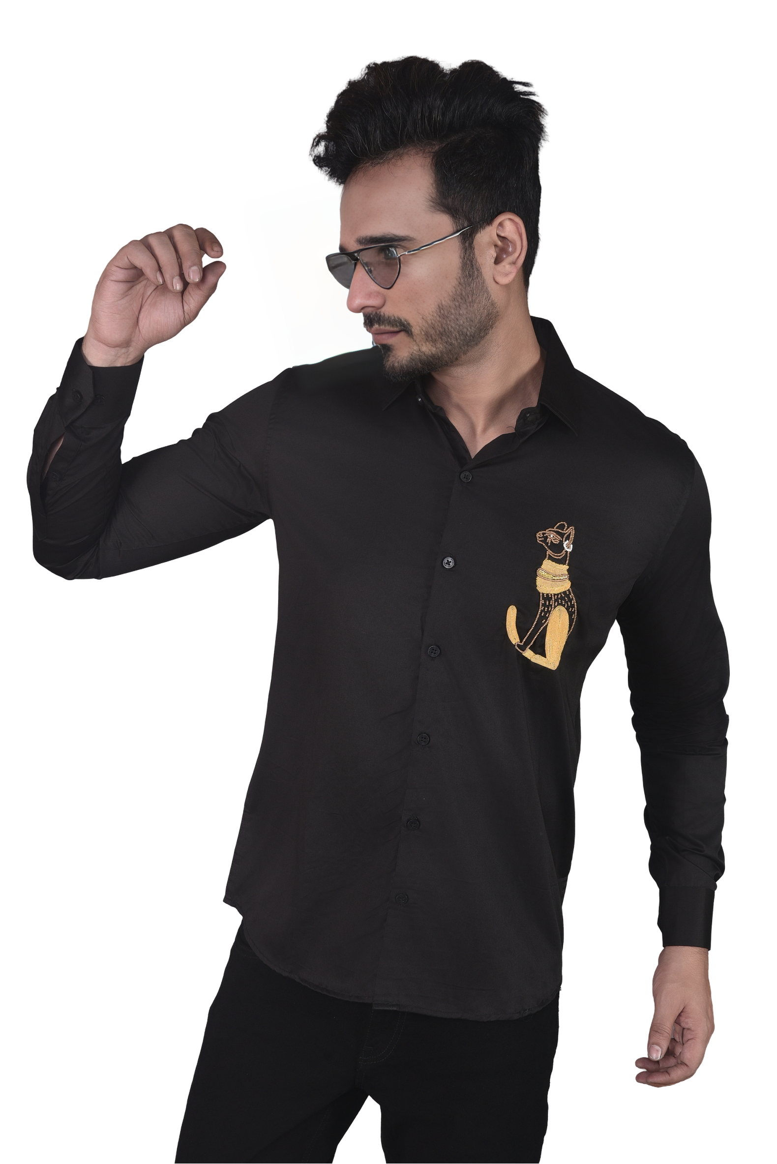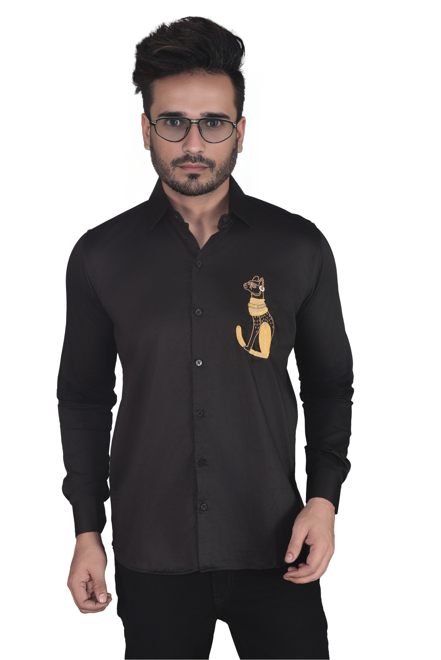 A black shirt featuring an animal embroidery is a striking fashion statement that exudes confidence and a sense of boldness. The animal design can symbolize strength and elegance, adding a unique artistic flair to an otherwise classic piece. Ideal for both casual and semi-formal occasions, this shirt pairs well with jeans or tailored trousers, allowing you to showcase your adventurous style while maintaining a polished look. The intricate embroidery elevates the shirt, making it a standout choice for those looking to express their individuality.