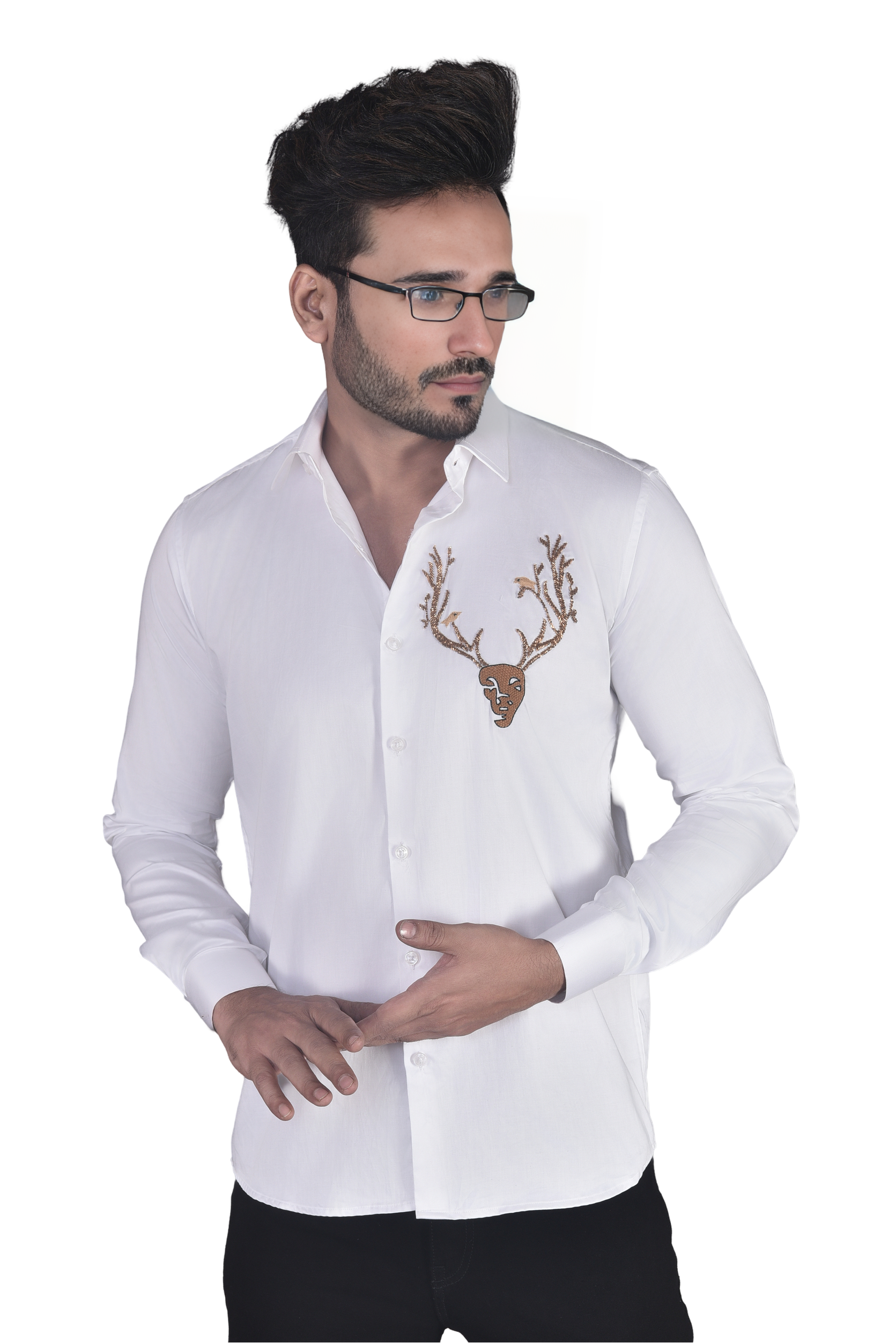 A shirt adorned with an embroidered reindeer face offers a delightful and festive design, perfect for the winter season or holiday celebrations. The intricate stitching can highlight the reindeer's antlers and features, creating a charming and whimsical look that adds personality to the garment. This playful motif appeals to both kids and adults, making the shirt suitable for family gatherings, cozy outings, or as a fun addition to casual attire during the holidays.