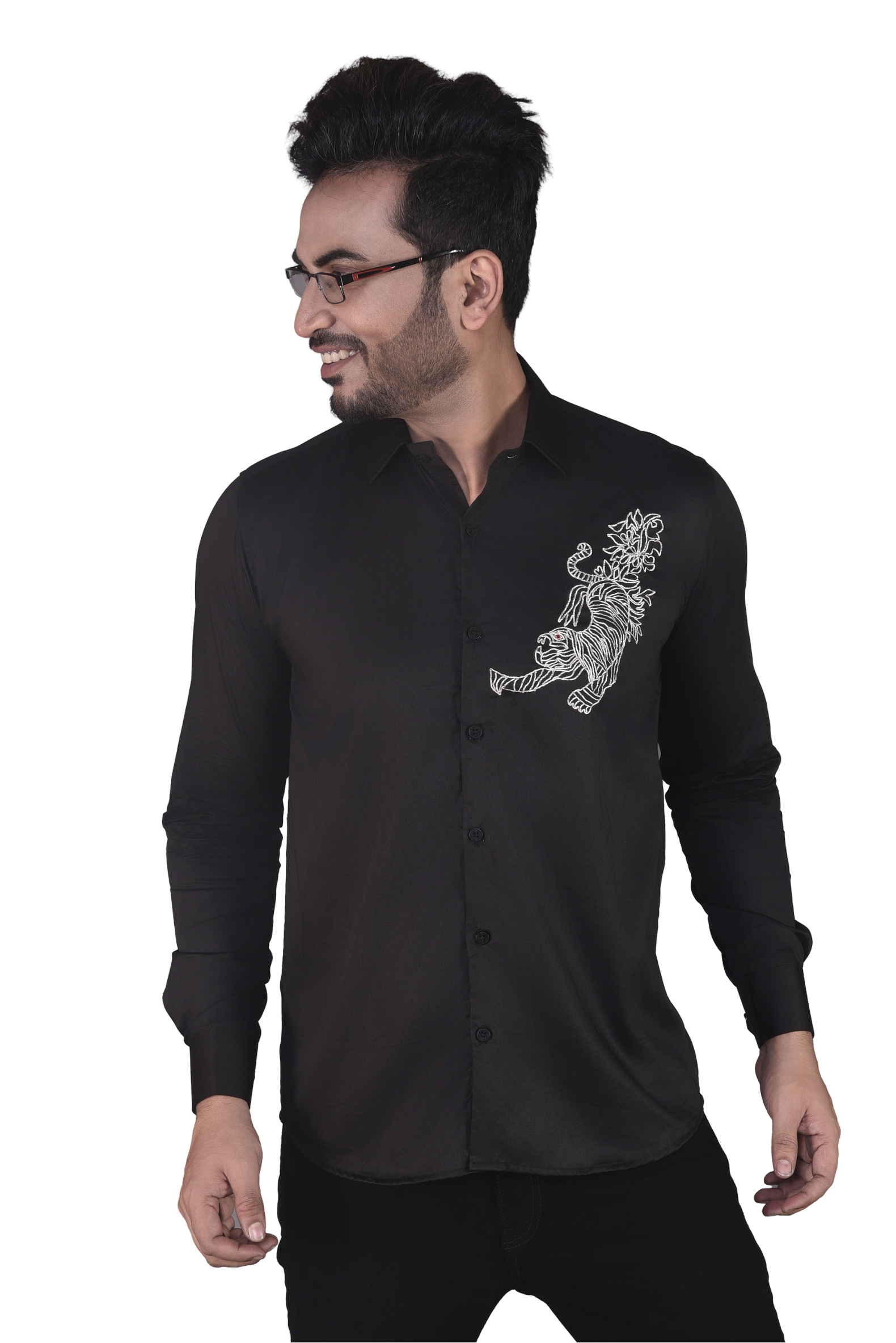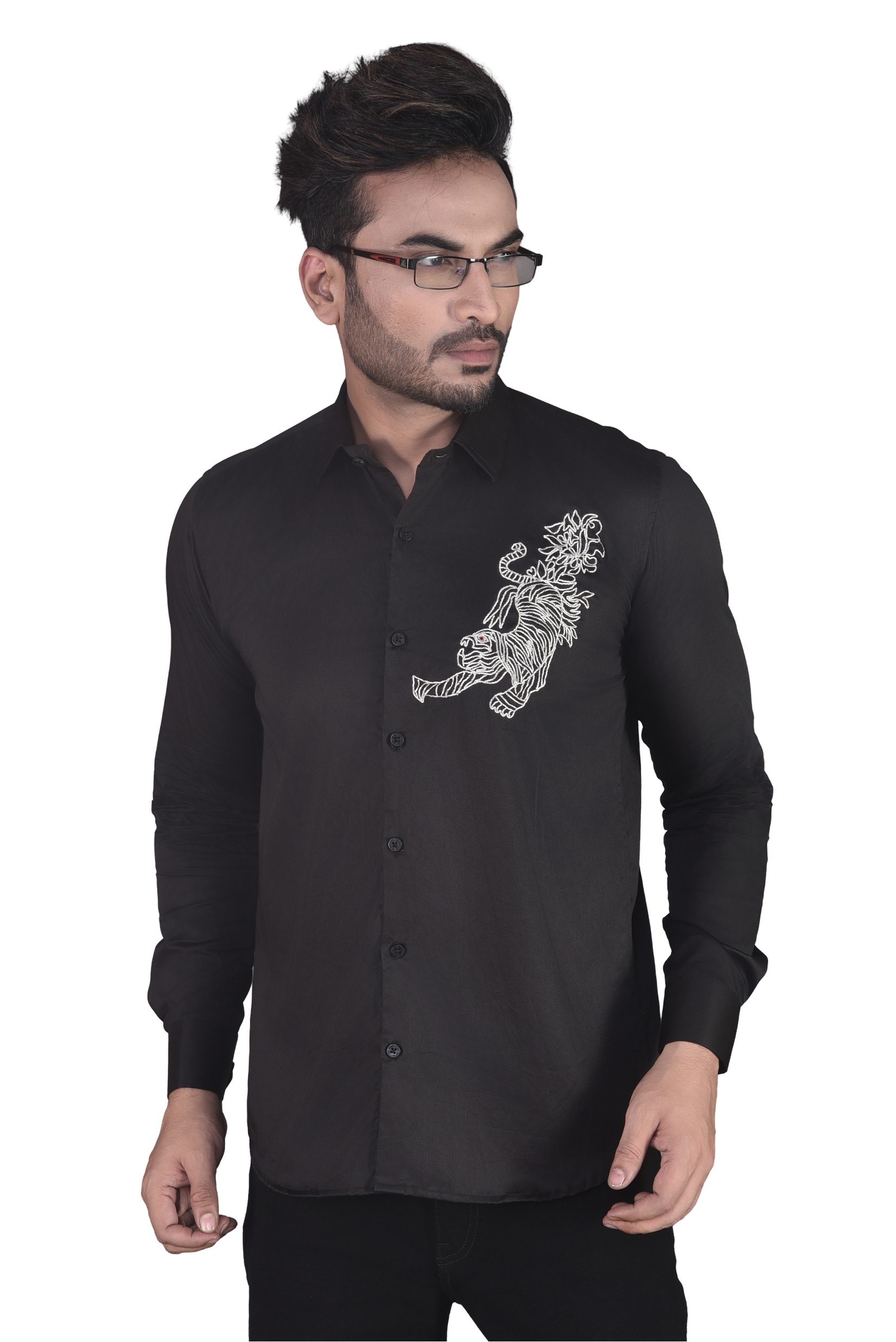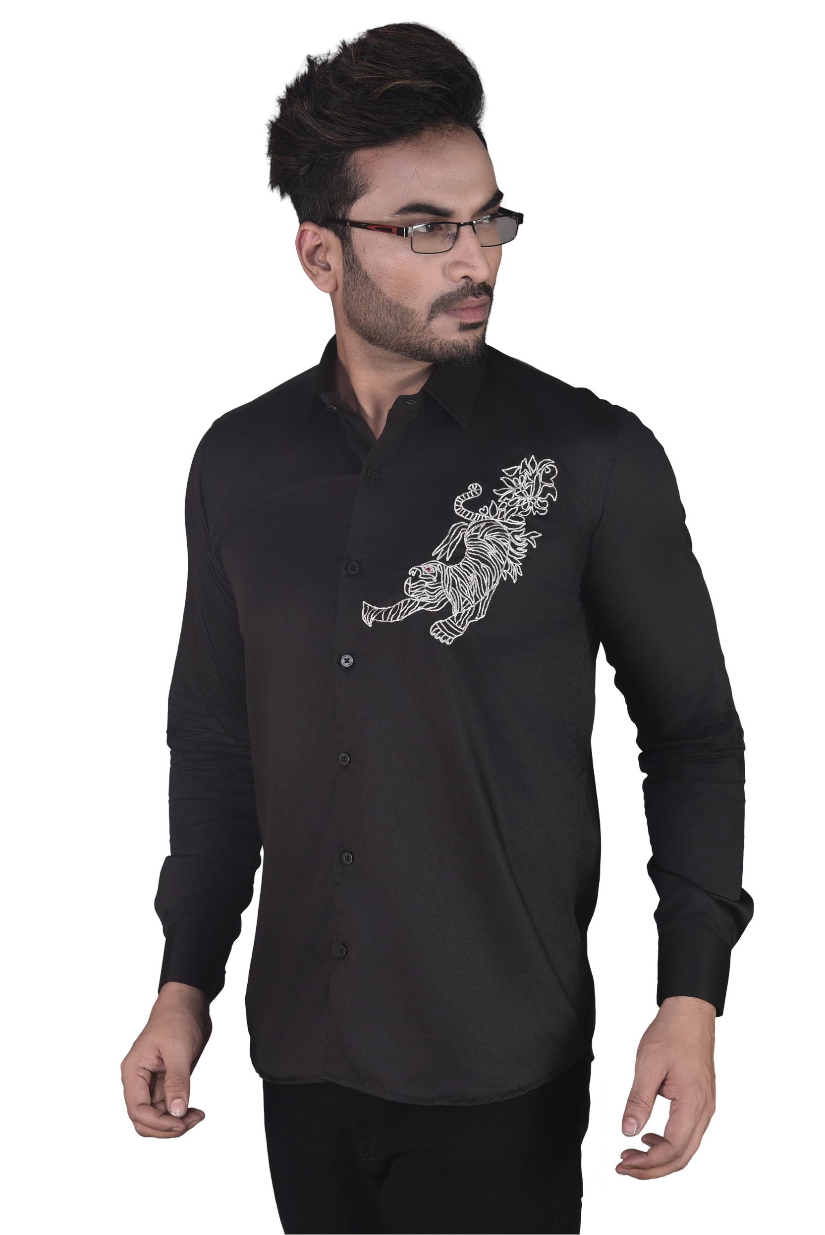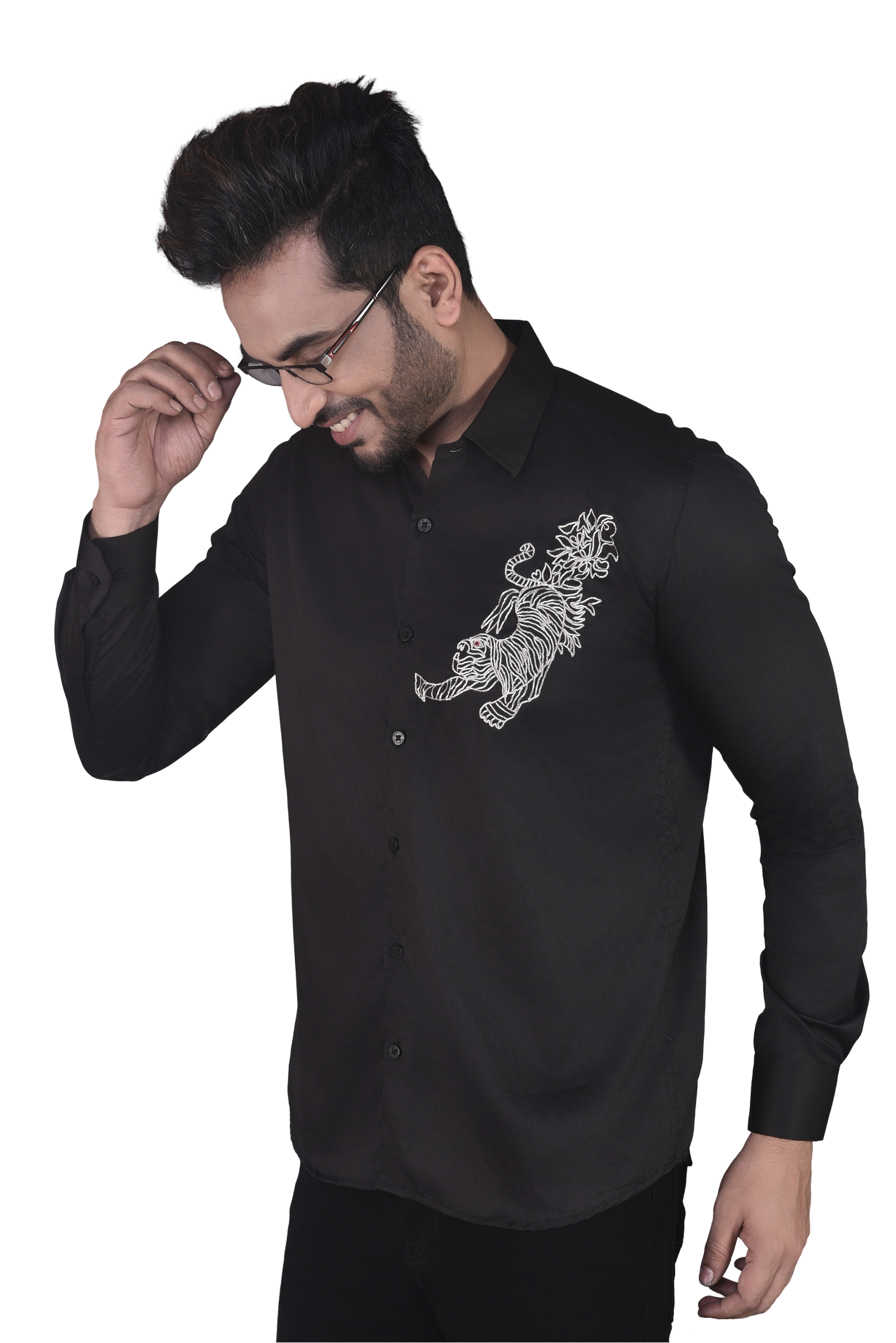 A black shirt with a hand-embroidered tiger design makes a bold fashion statement, blending artistry with a sense of strength and wildness. The intricate embroidery captures the fierce beauty of the tiger, adding a unique and vibrant touch to an otherwise classic garment. This shirt is perfect for those looking to express their adventurous spirit and personal style, making it suitable for casual outings or nights out. The striking imagery elevates the shirt to a piece of wearable art that stands out in any setting.