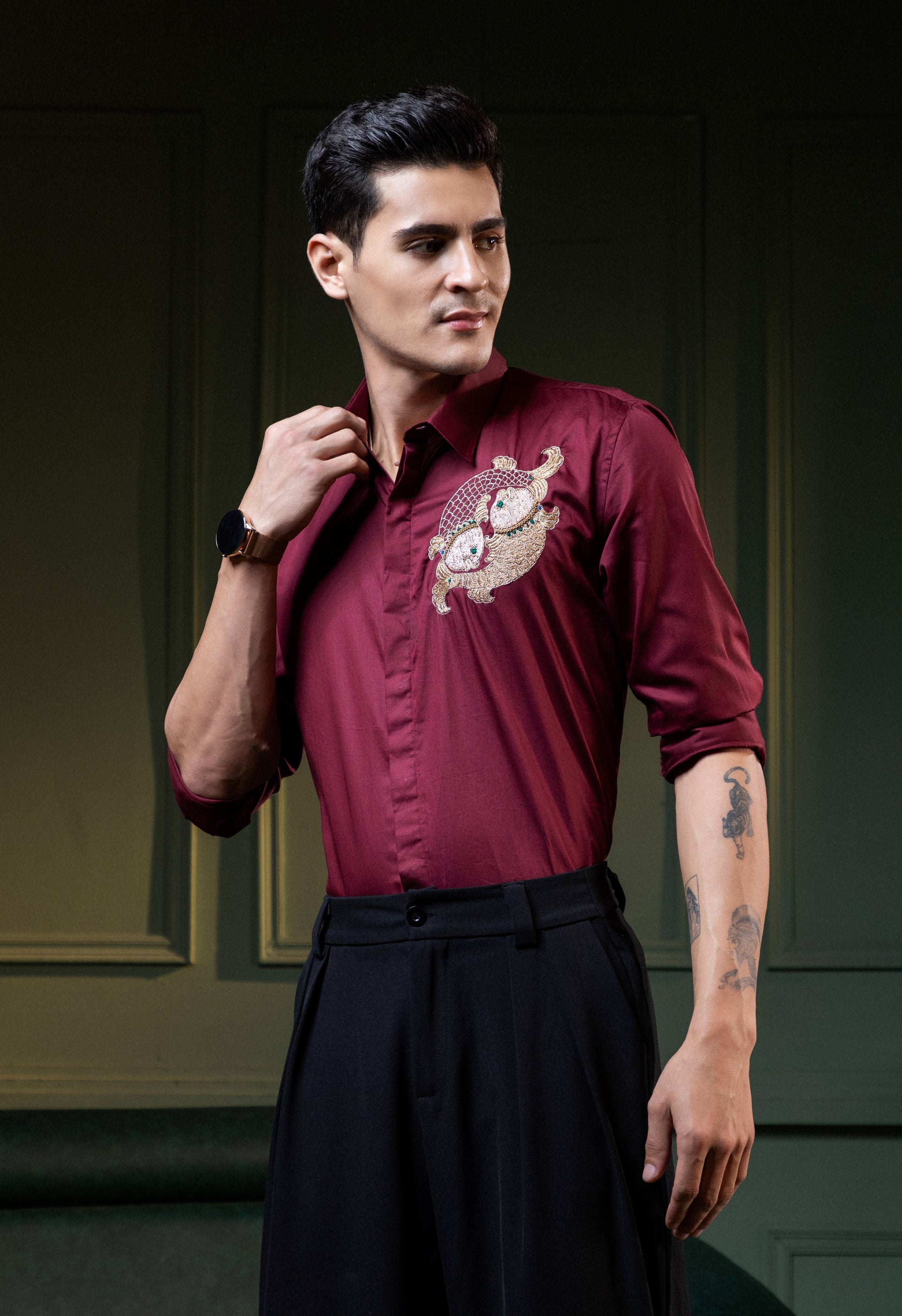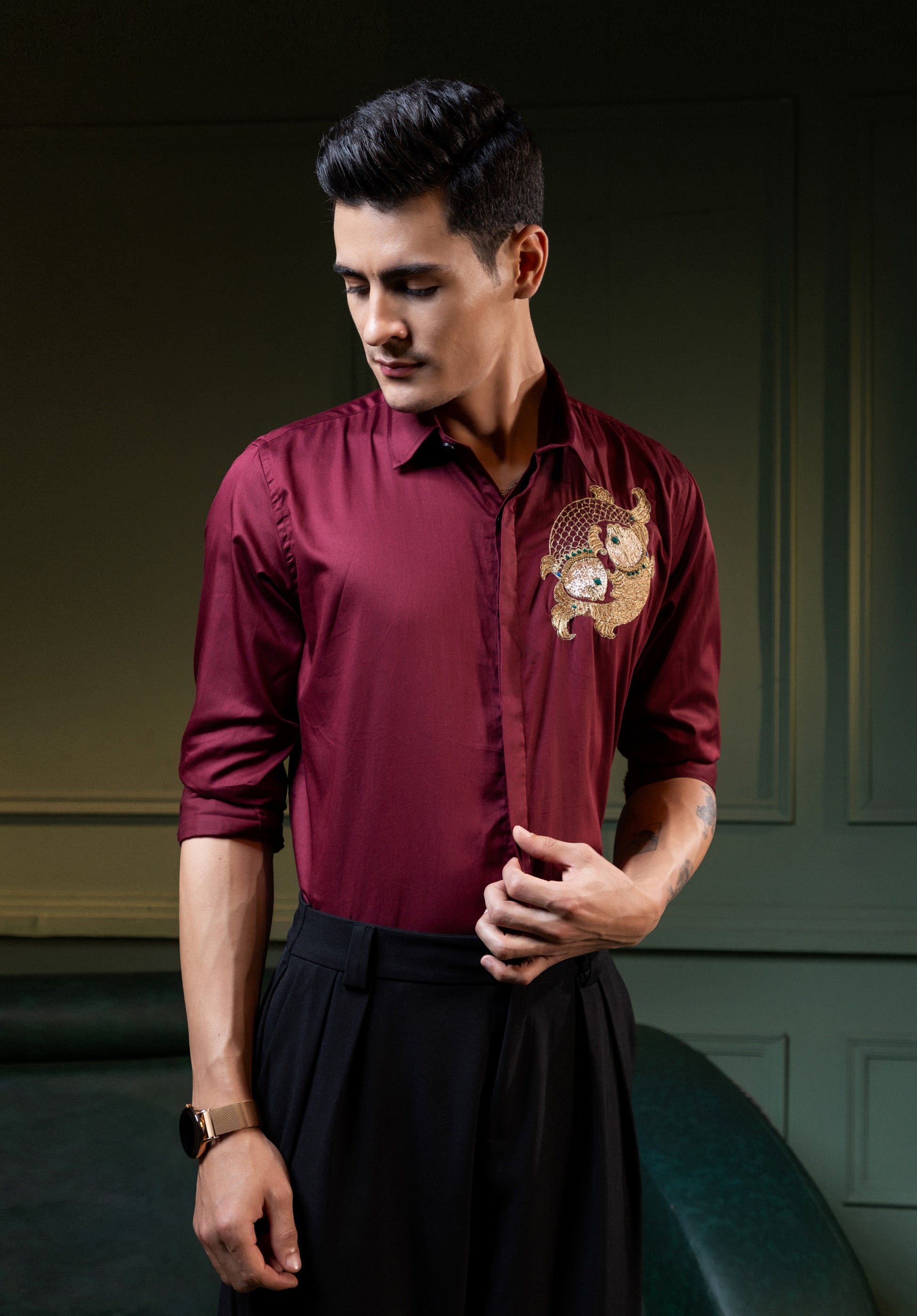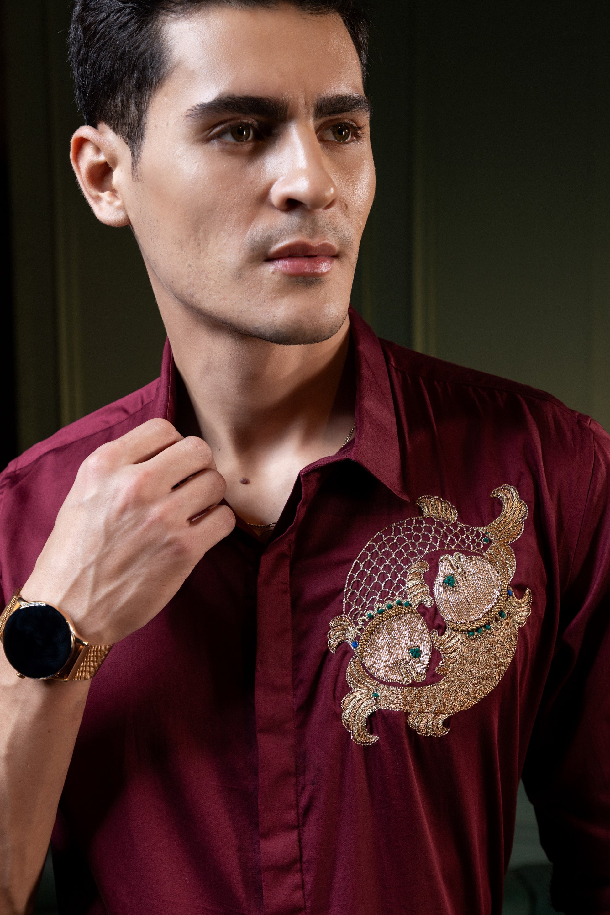 Elevate your style with this classic maroon shirt featuring two beautifully embroidered fish. The intricate stitching adds a touch of elegance and sophistication to any outfit. Made with high-quality materials, this shirt is both comfortable and stylish, making it a perfect addition to your wardrobe.