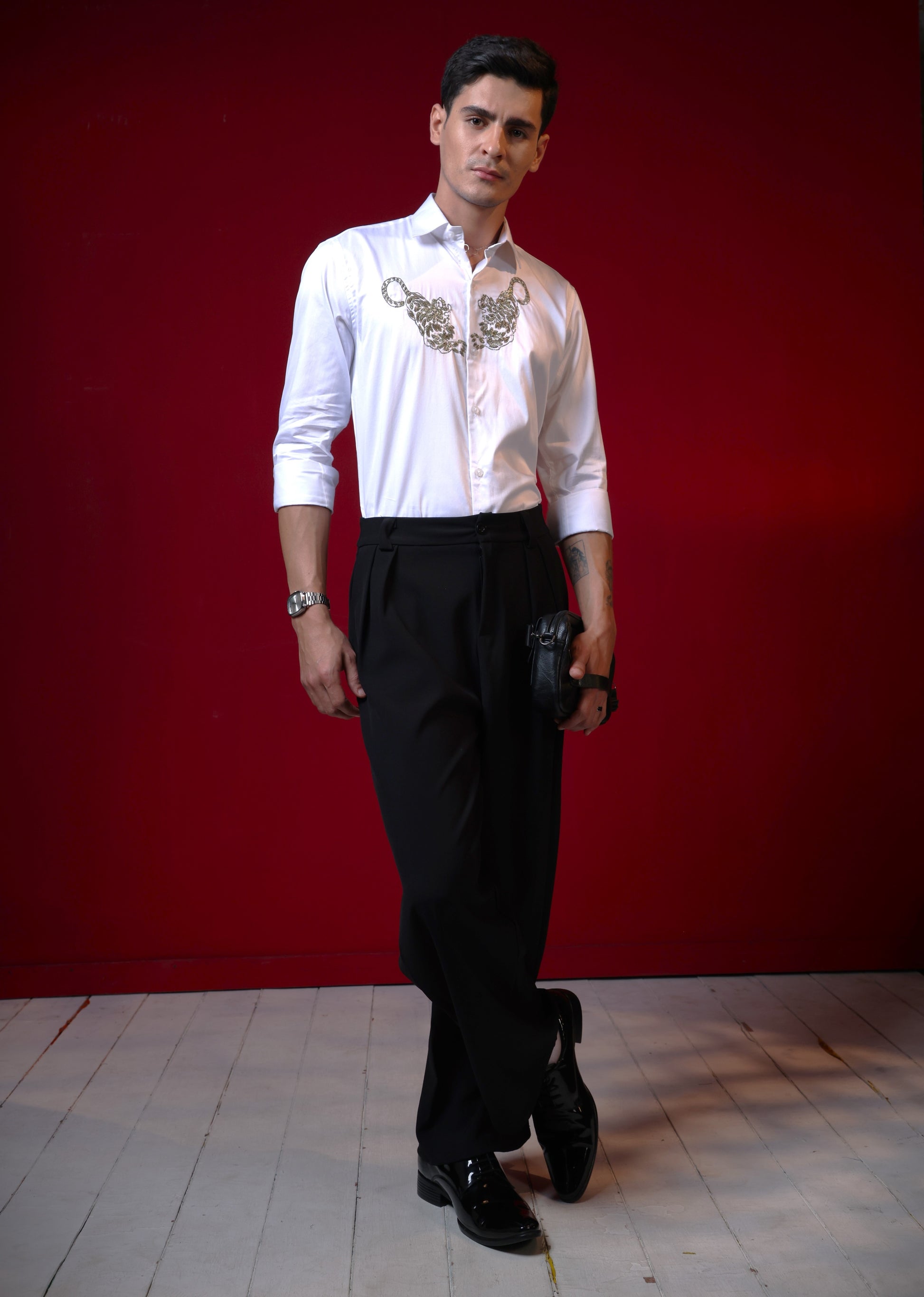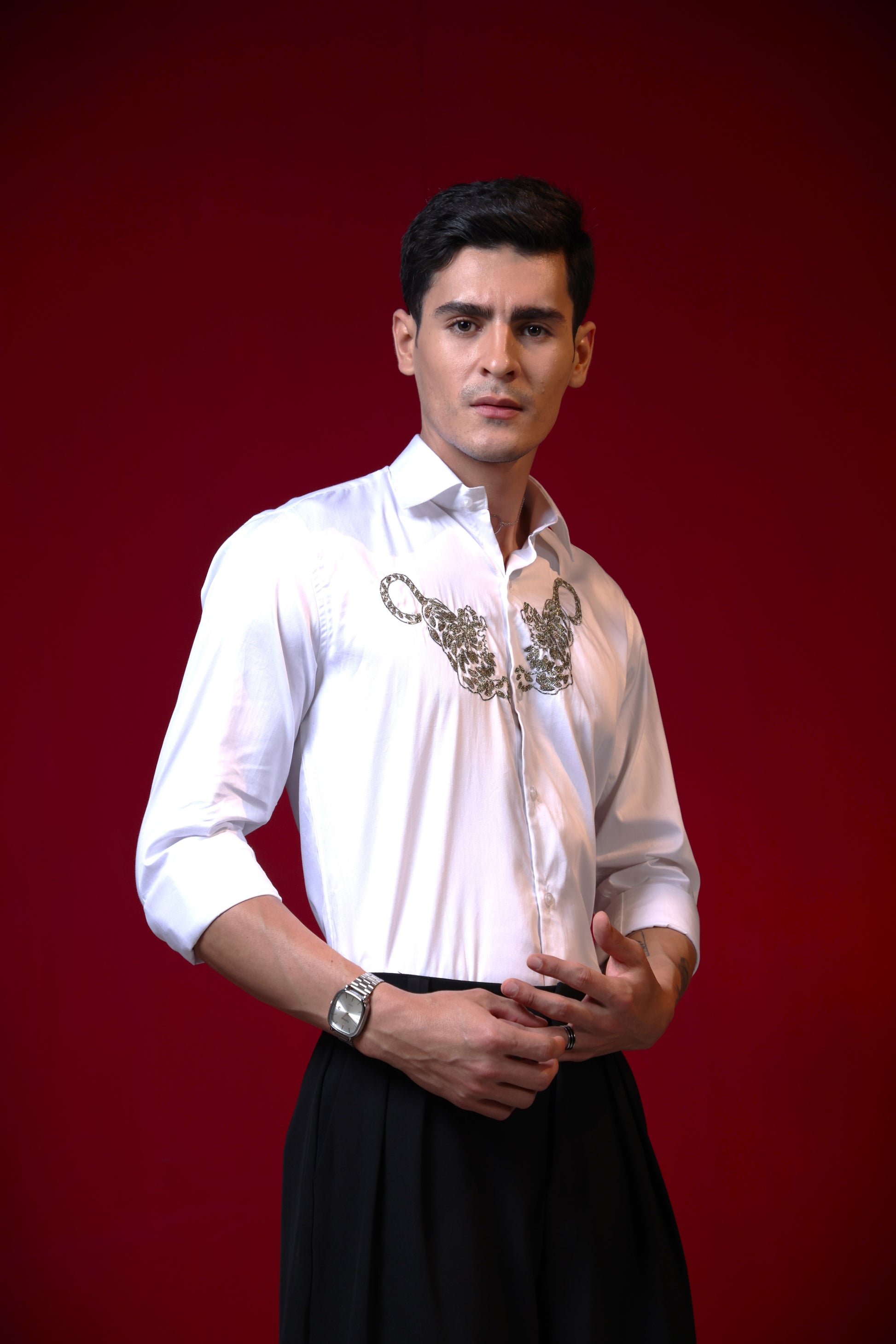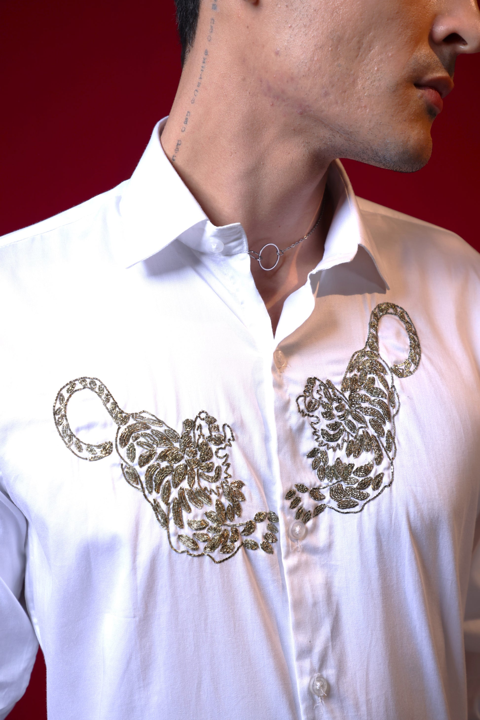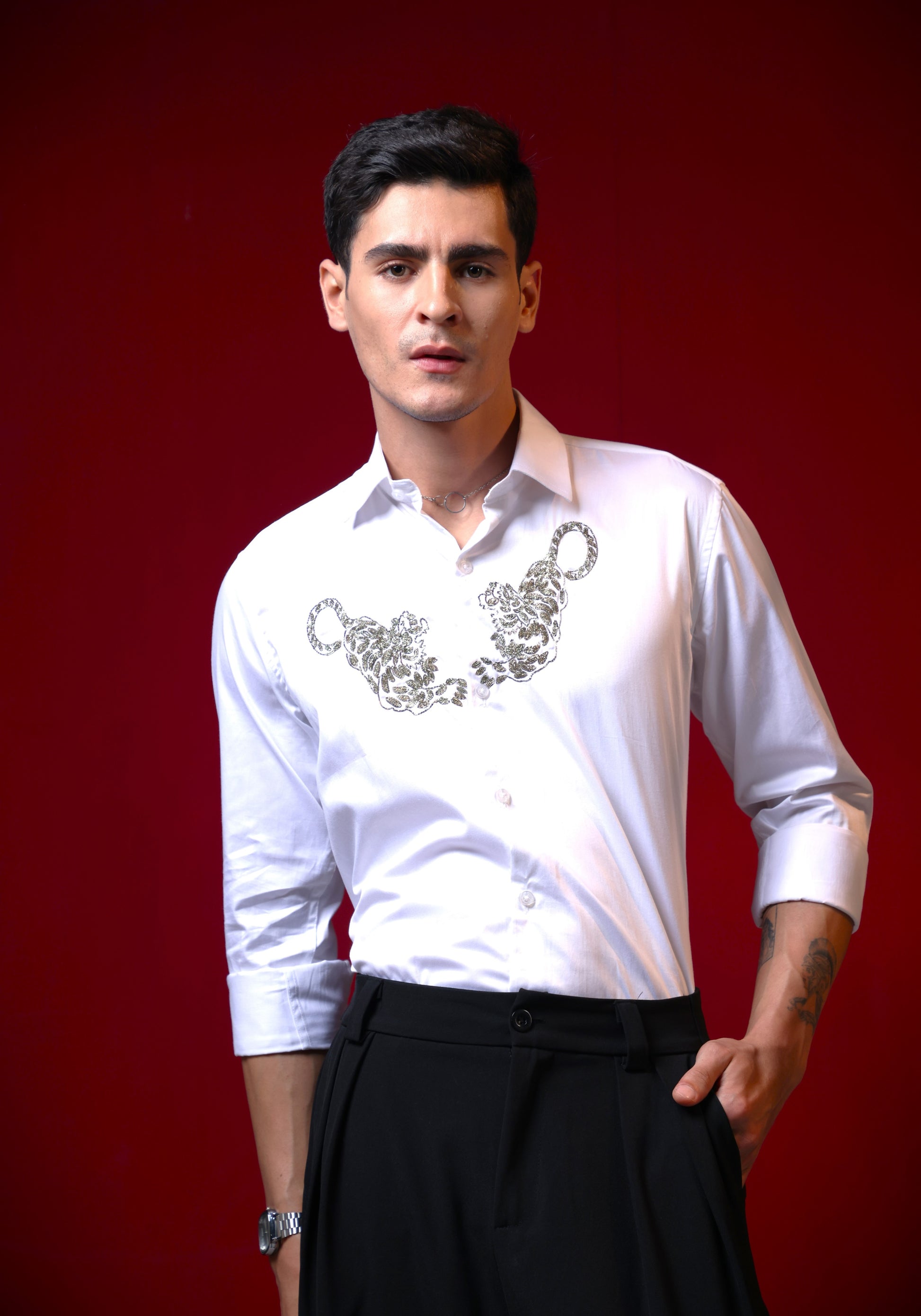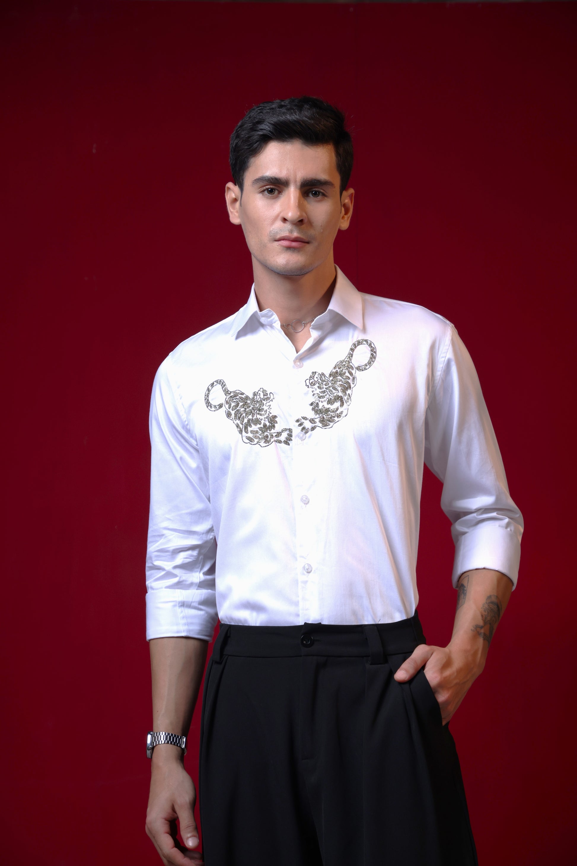 A white shirt featuring two embroidered tigers can create a striking and bold fashion statement. The vibrant tigers, meticulously stitched onto the fabric, add an eye-catching element that contrasts beautifully with the crisp white background. This design not only showcases artistry and attention to detail but also symbolizes strength, courage, and power. Perfect for both casual outings and more upscale events, this shirt can be paired with jeans or tailored trousers, making it a versatile addition to any wardrobe that exudes confidence and style.