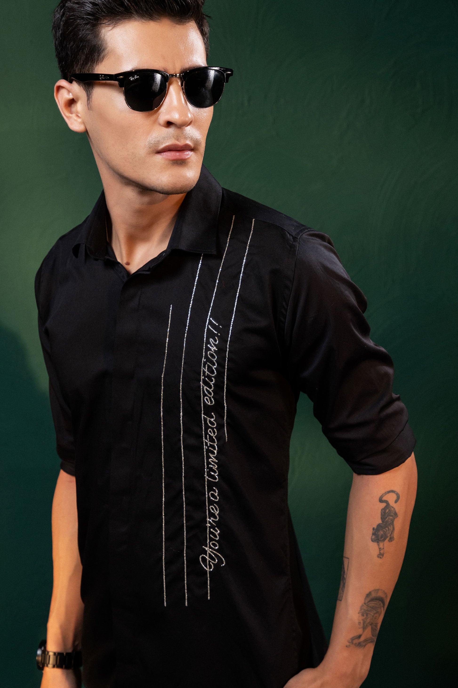 Expertly designed for those who are one-of-a-kind, our LIMITED EDITION shirt features perfectly embroidered text that highlights your unique qualities. Stand out from the crowd and showcase your individuality with this one-of-a-kind shirt.